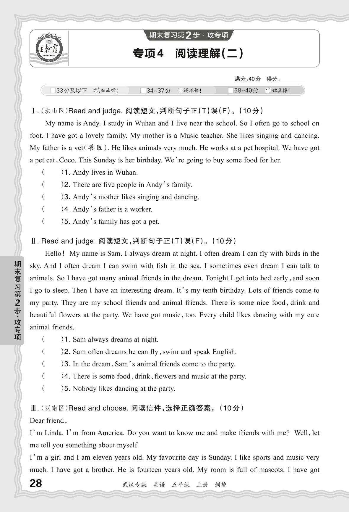 2023秋上册五年级英语剑桥版 期末专项·阅读理解(二)【4】