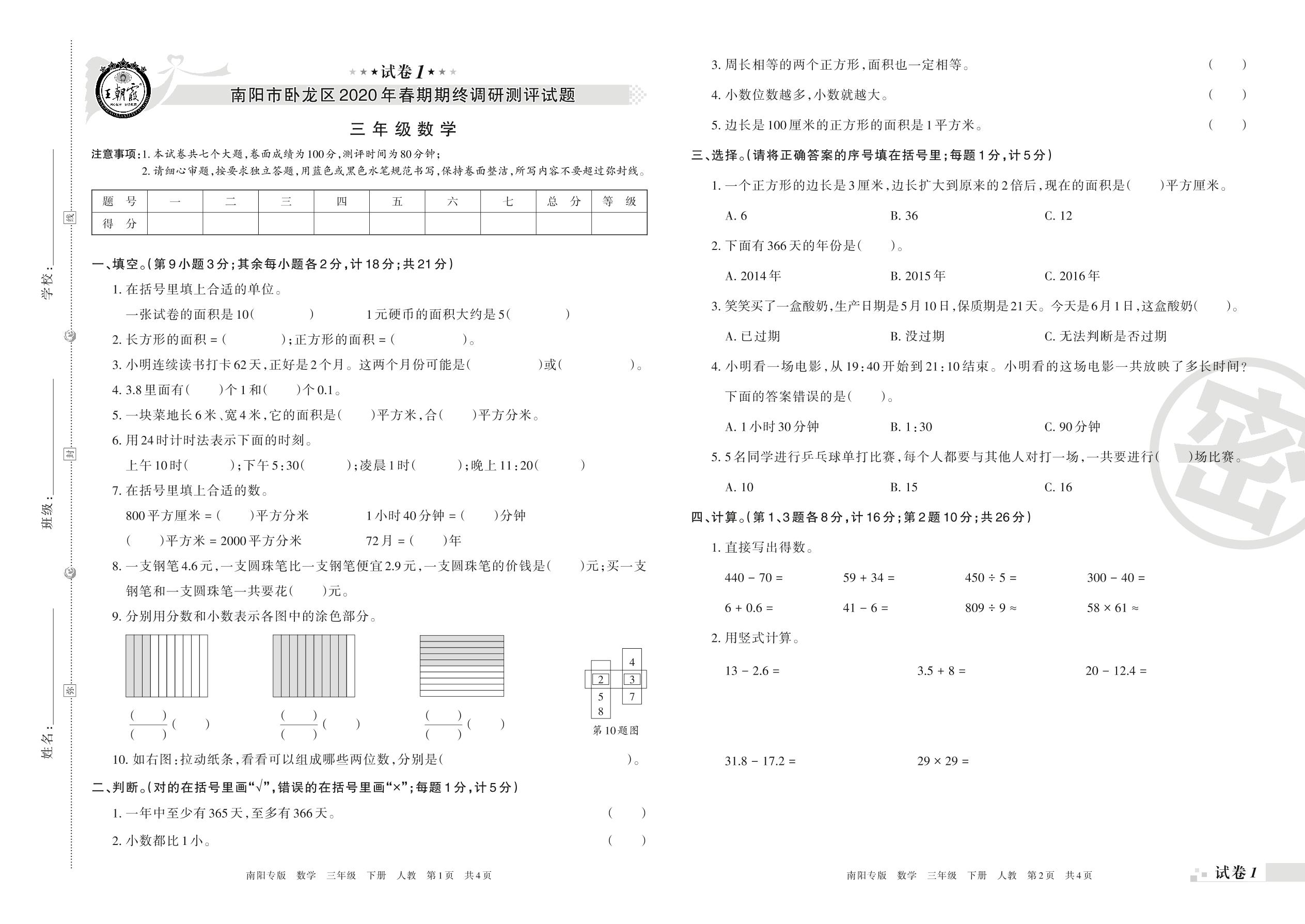 2019-2020学年第二学期南阳市卧龙区三年级数学试卷(人教版)【1】