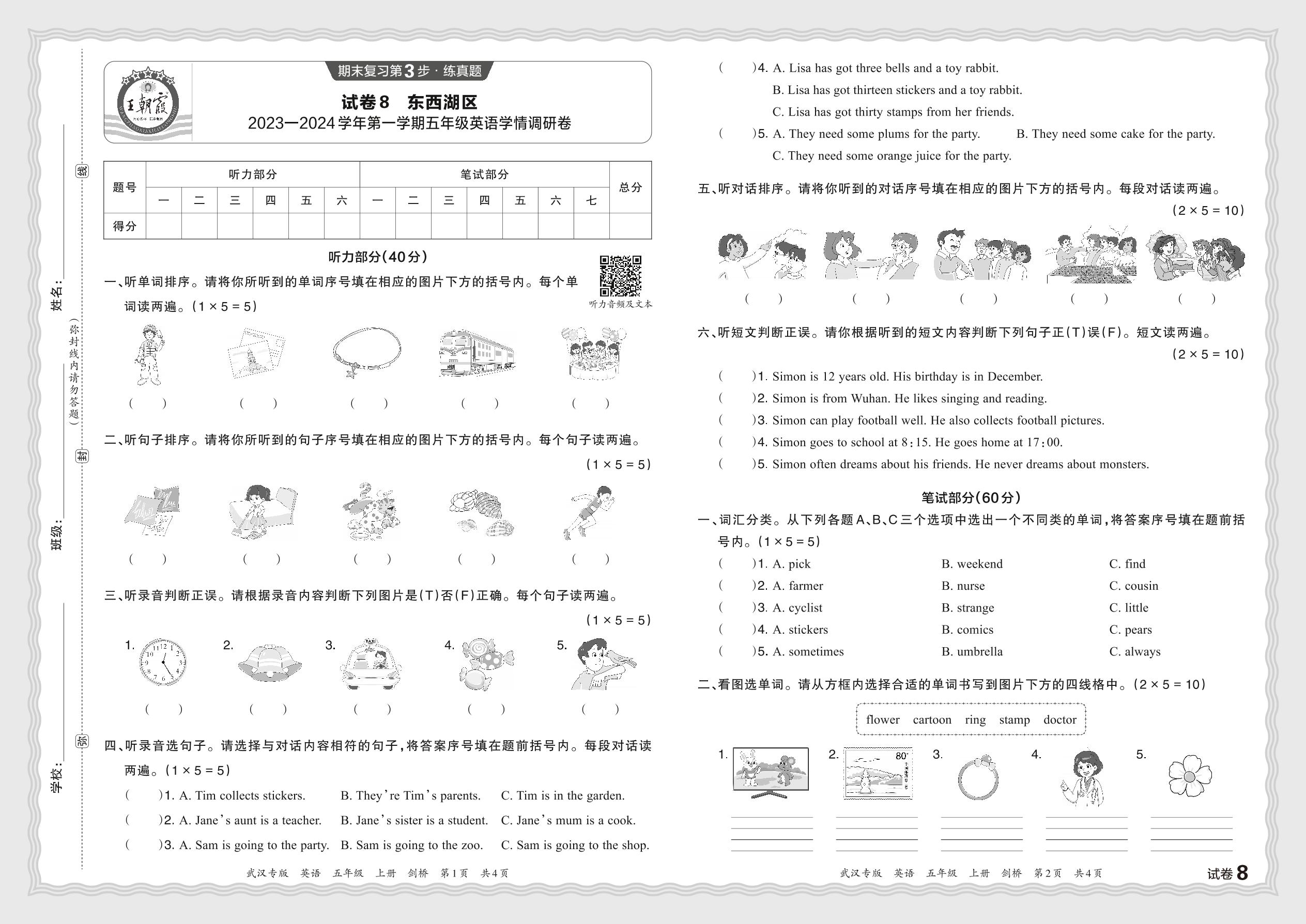湖北省武汉市东西湖区2023—2024学年第一学期五年级英语学情调研卷(剑桥版)【8】