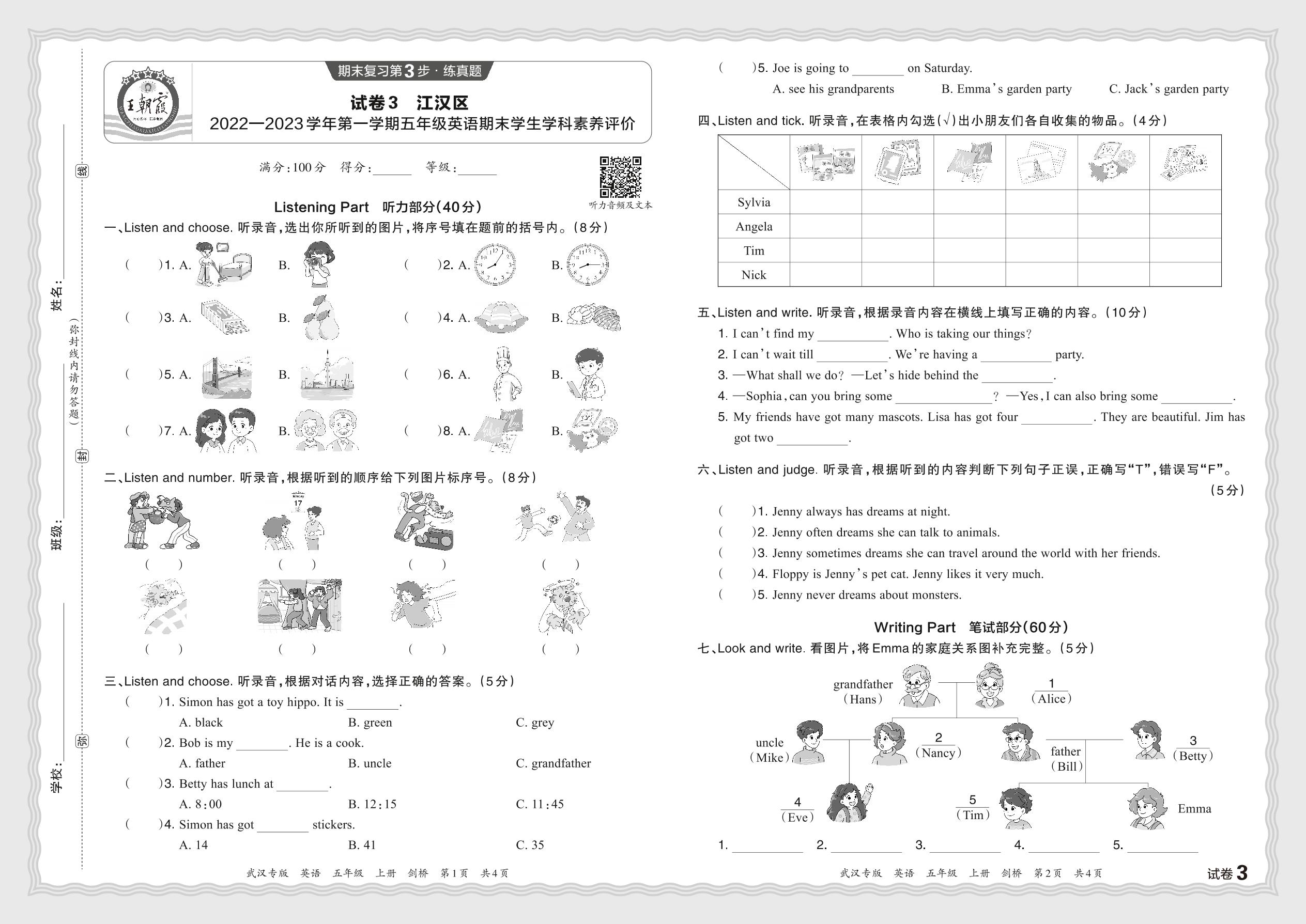 湖北省武汉市江汉区2022—2023学年第一学期五年级英语期末学生学科素养评价(剑桥版)【3】