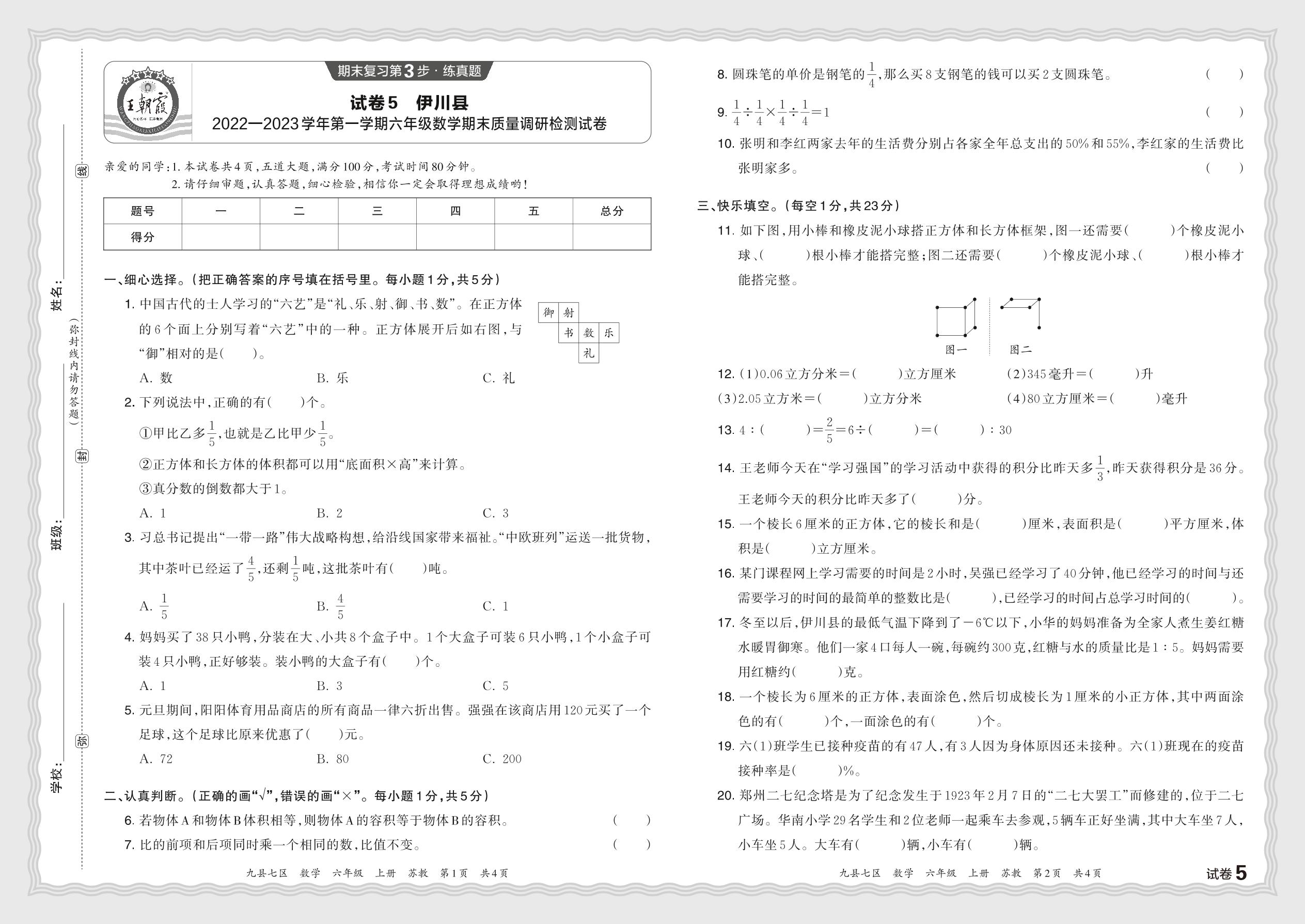 河南省洛阳市伊川县2022—2023学年第一学期六年级数学期末质量调研检测试卷(苏教版)【5】