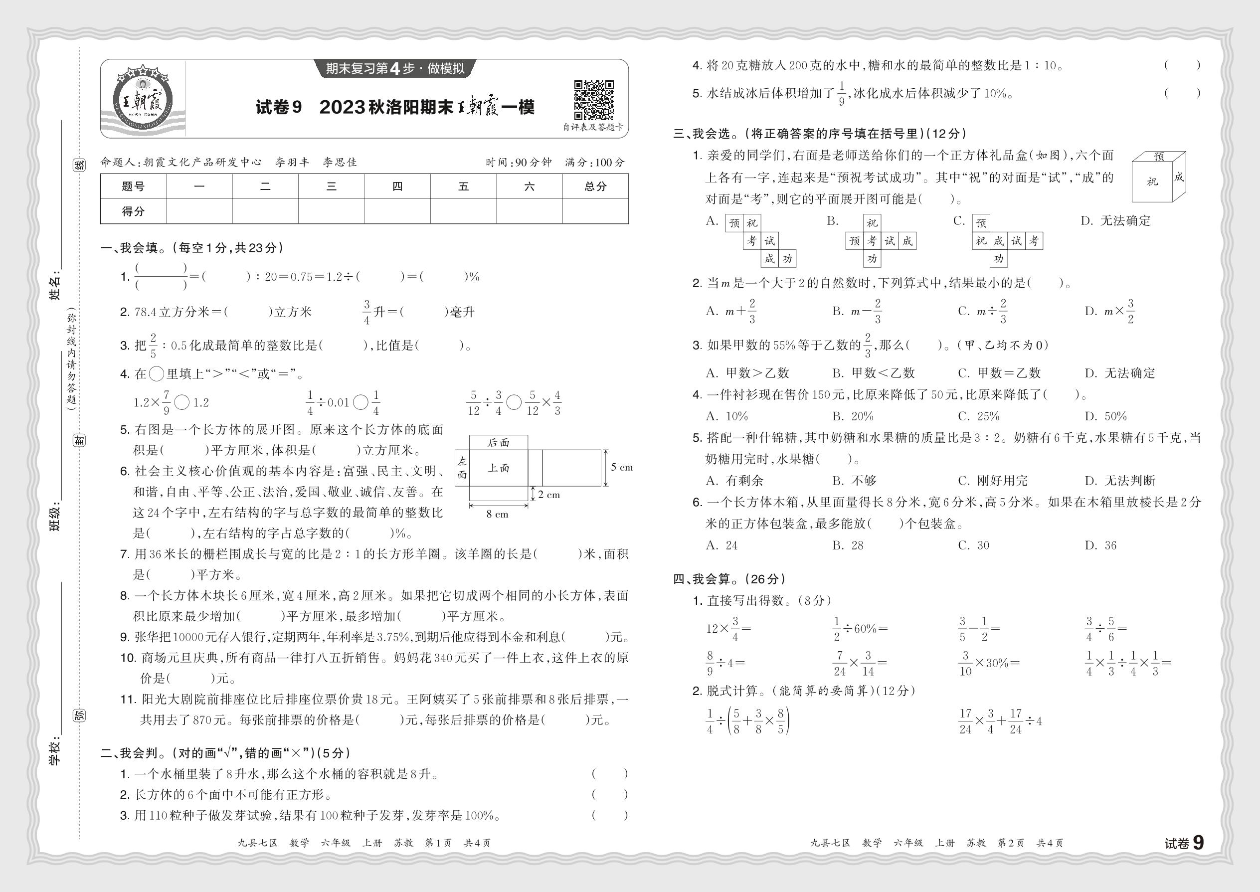 2023秋上册六年级数学苏教版 河南洛阳期末王朝霞一模【9】