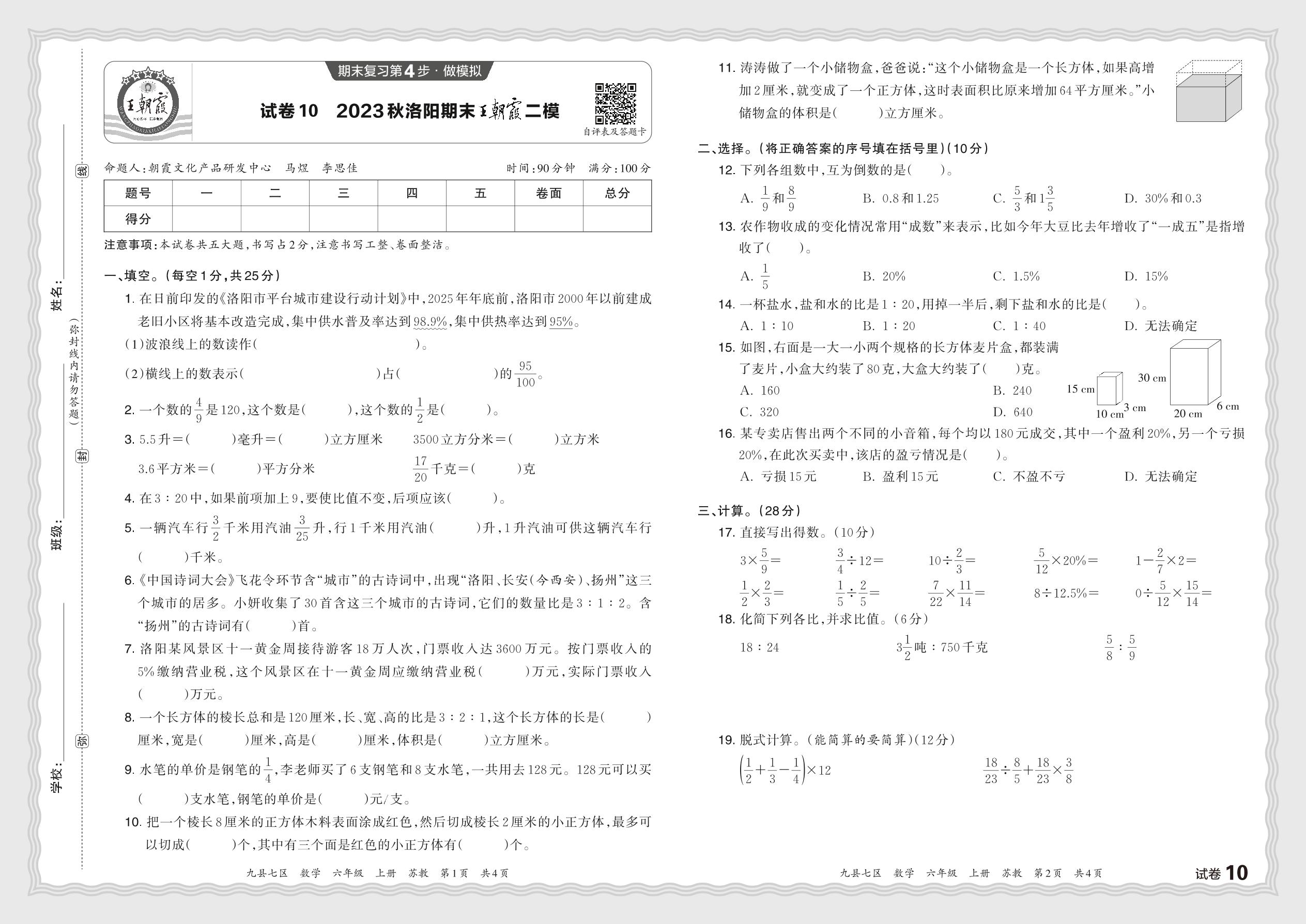2023秋上册六年级数学苏教版 河南洛阳期末王朝霞二模【10】