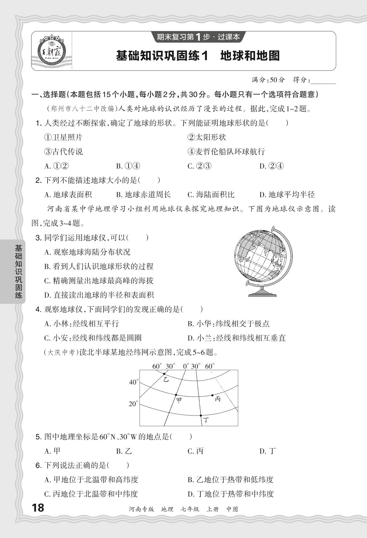 2023秋上册七年级地理中图版 期末过课本·基础知识巩固练 地球和地图【1】