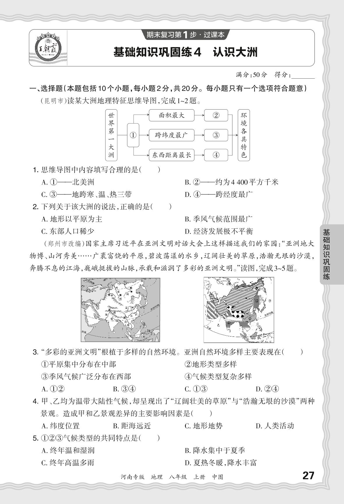 2023秋上册八年级地理中图版 期末过课本·基础知识巩固练 认识大洲【4】