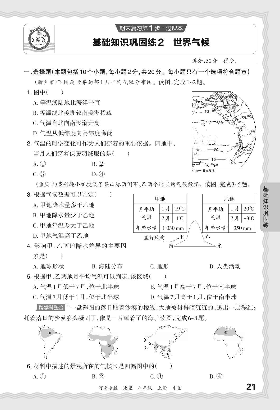 2023秋上册八年级地理中图版 期末过课本·基础知识巩固练 世界气候【2】