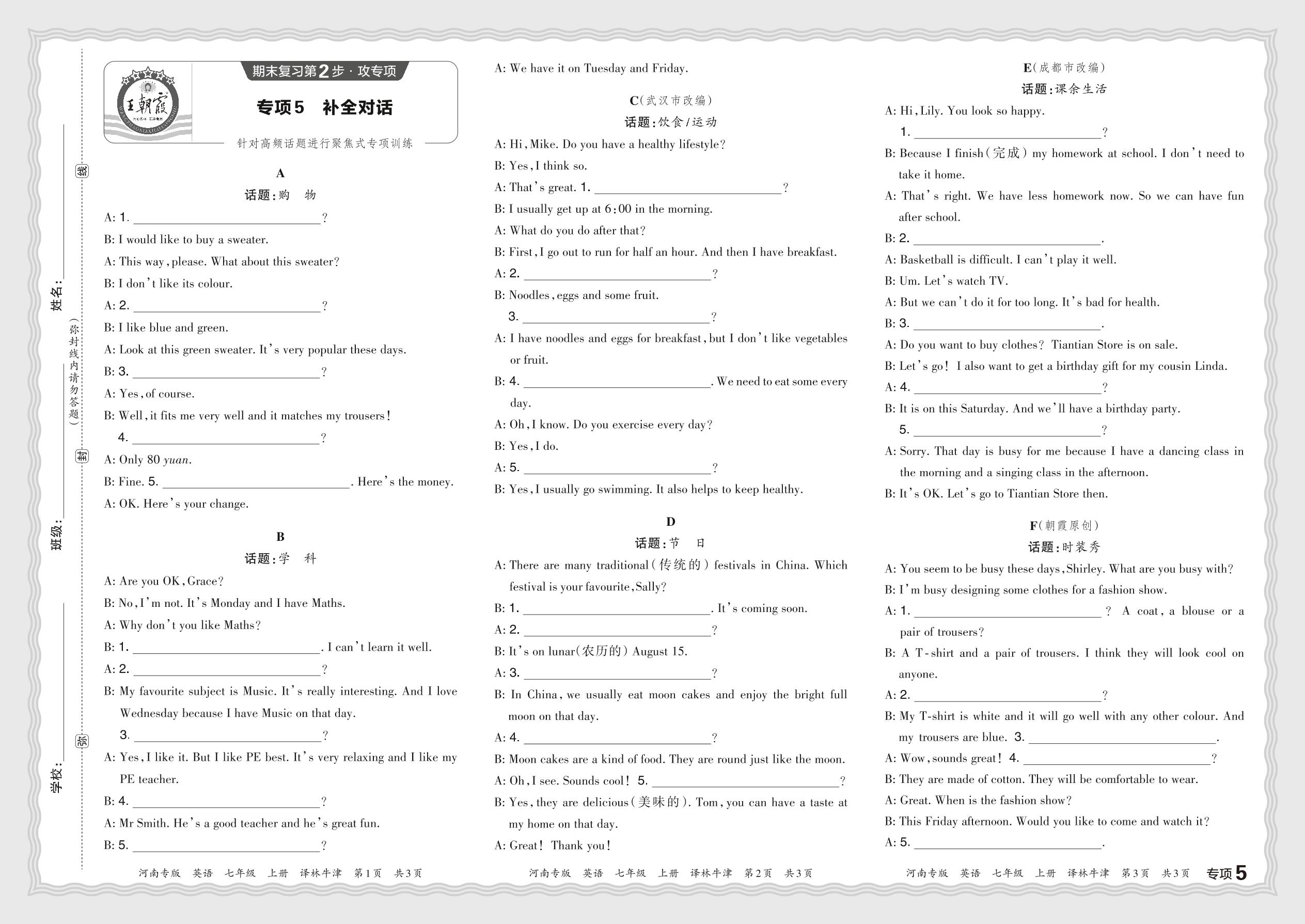 2023秋上册七年级英语译林牛津版 期末专项卷·补全对话【5】