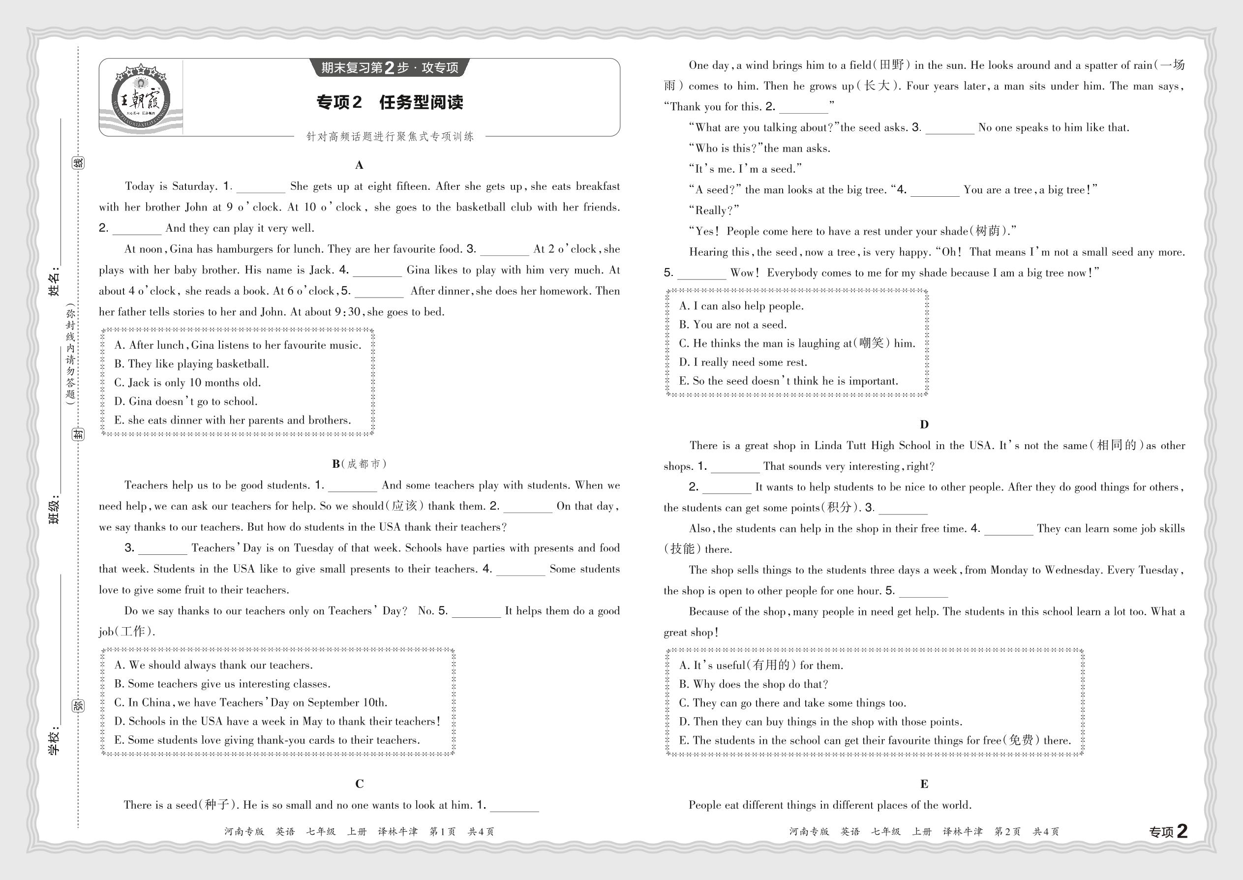 2023秋上册七年级英语译林牛津版 期末专项卷·任务型阅读【2】