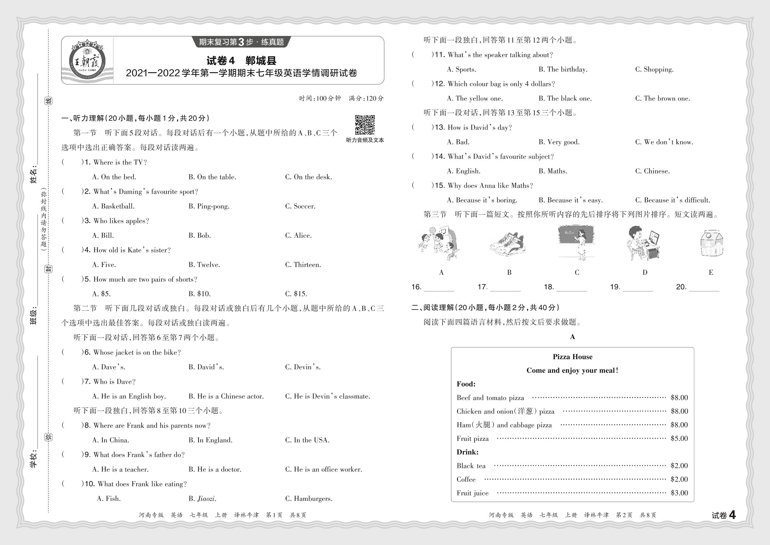 河南省周口市郸城县2021—2022学年第一学期期未七年级英语学情调研试卷(译林牛津版)【4】
