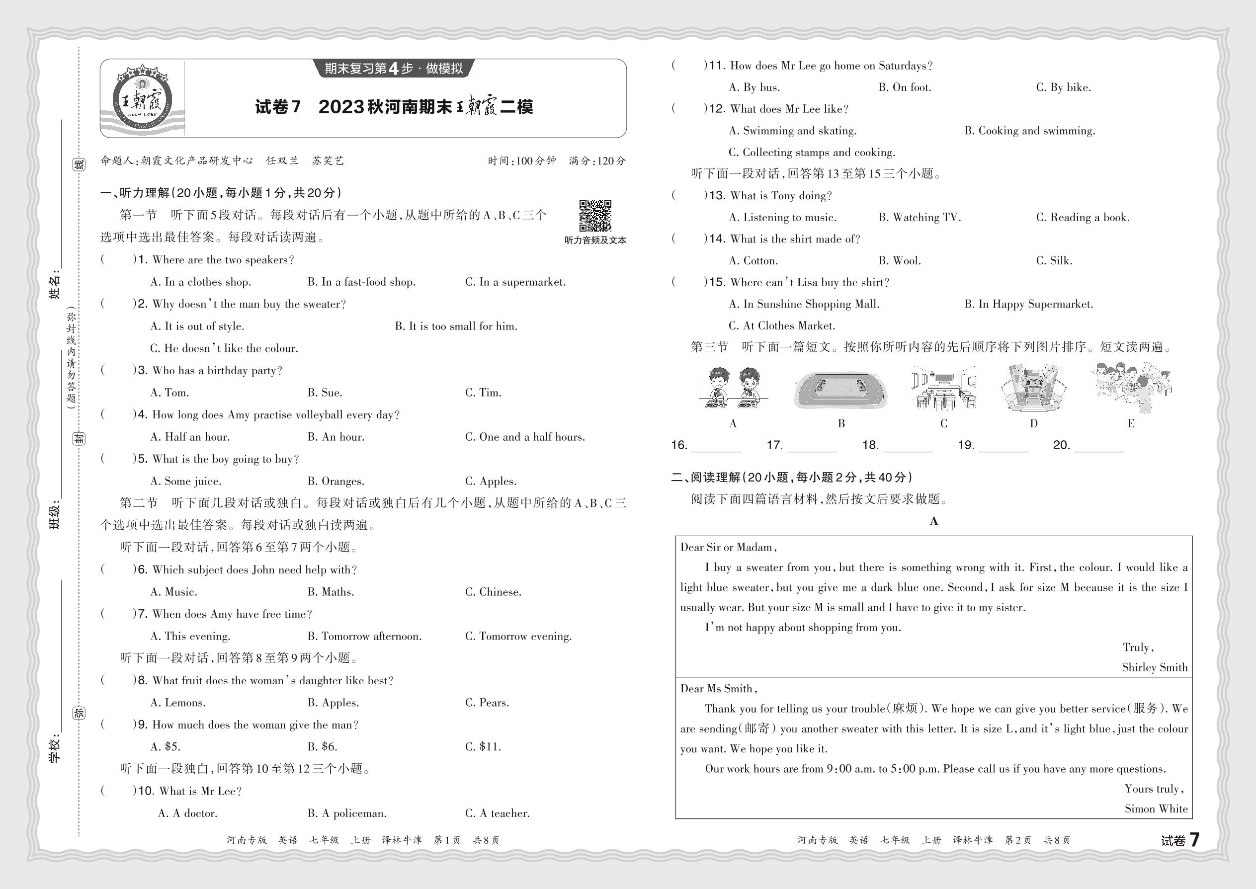 2023秋上册七年级英语译林牛津版 河南期末王朝霞二模