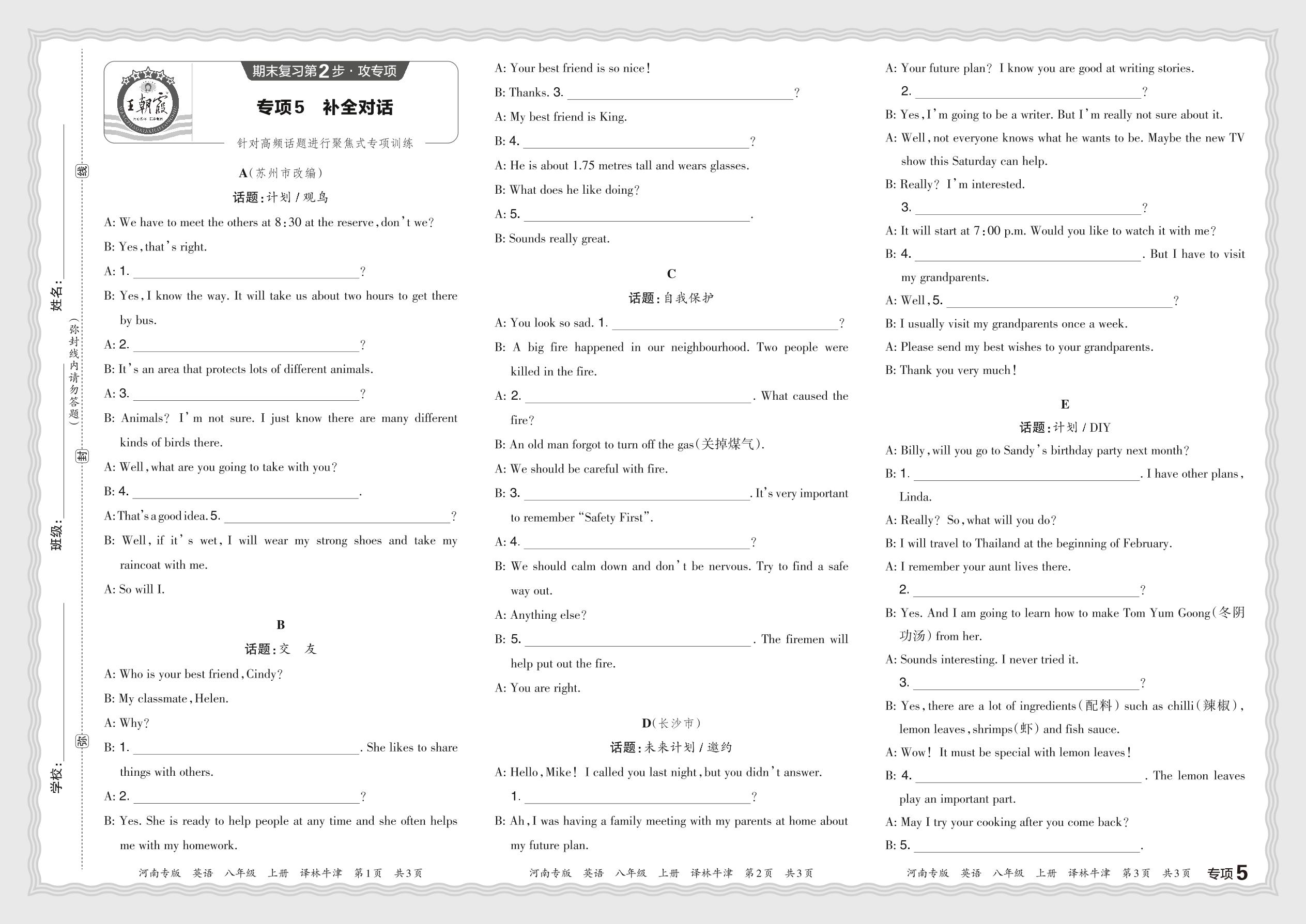 2023秋上册八年级英语译林牛津版 期末专项卷·补全对话【5】