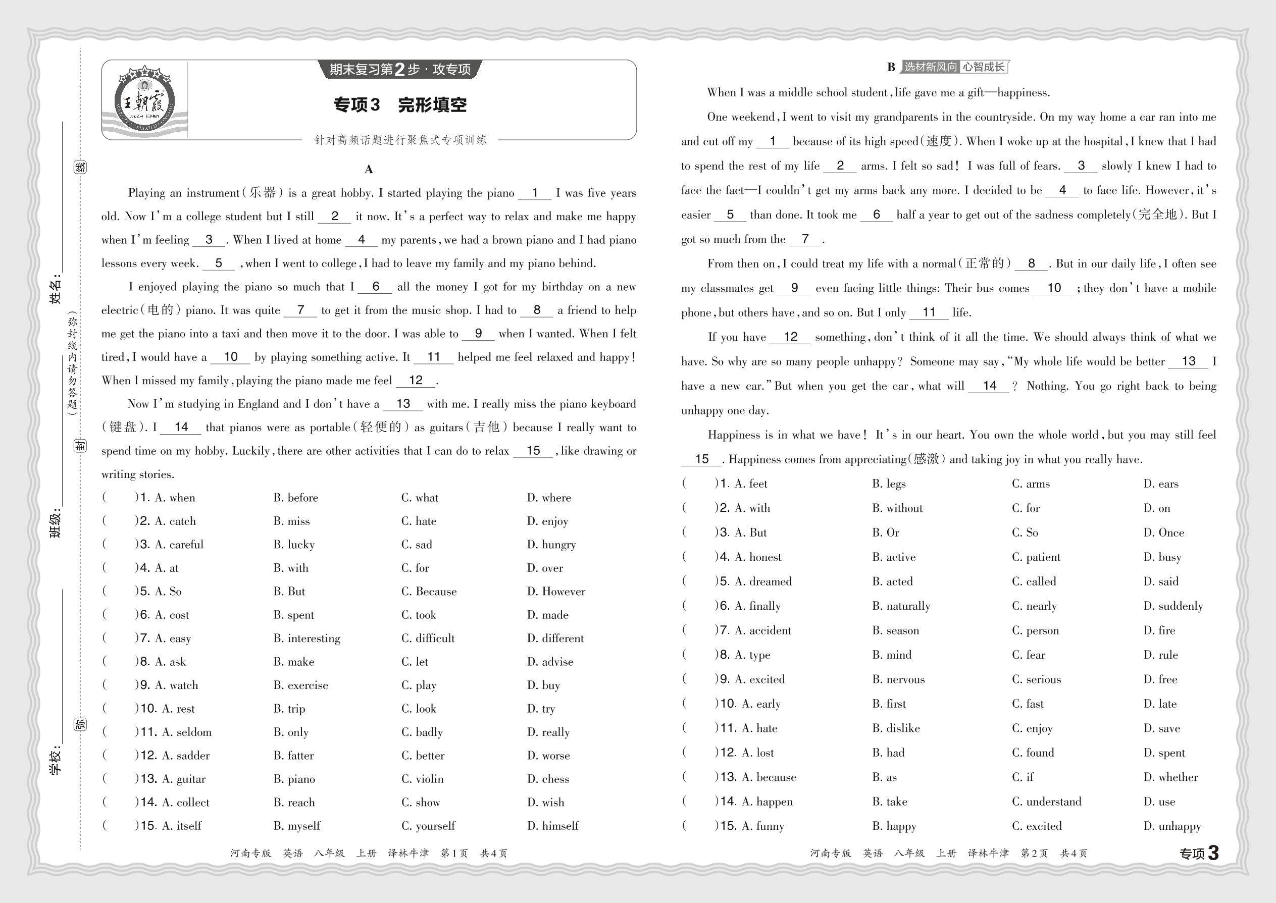 2023秋上册八年级英语译林牛津版 期末专项卷·完形填空【3】