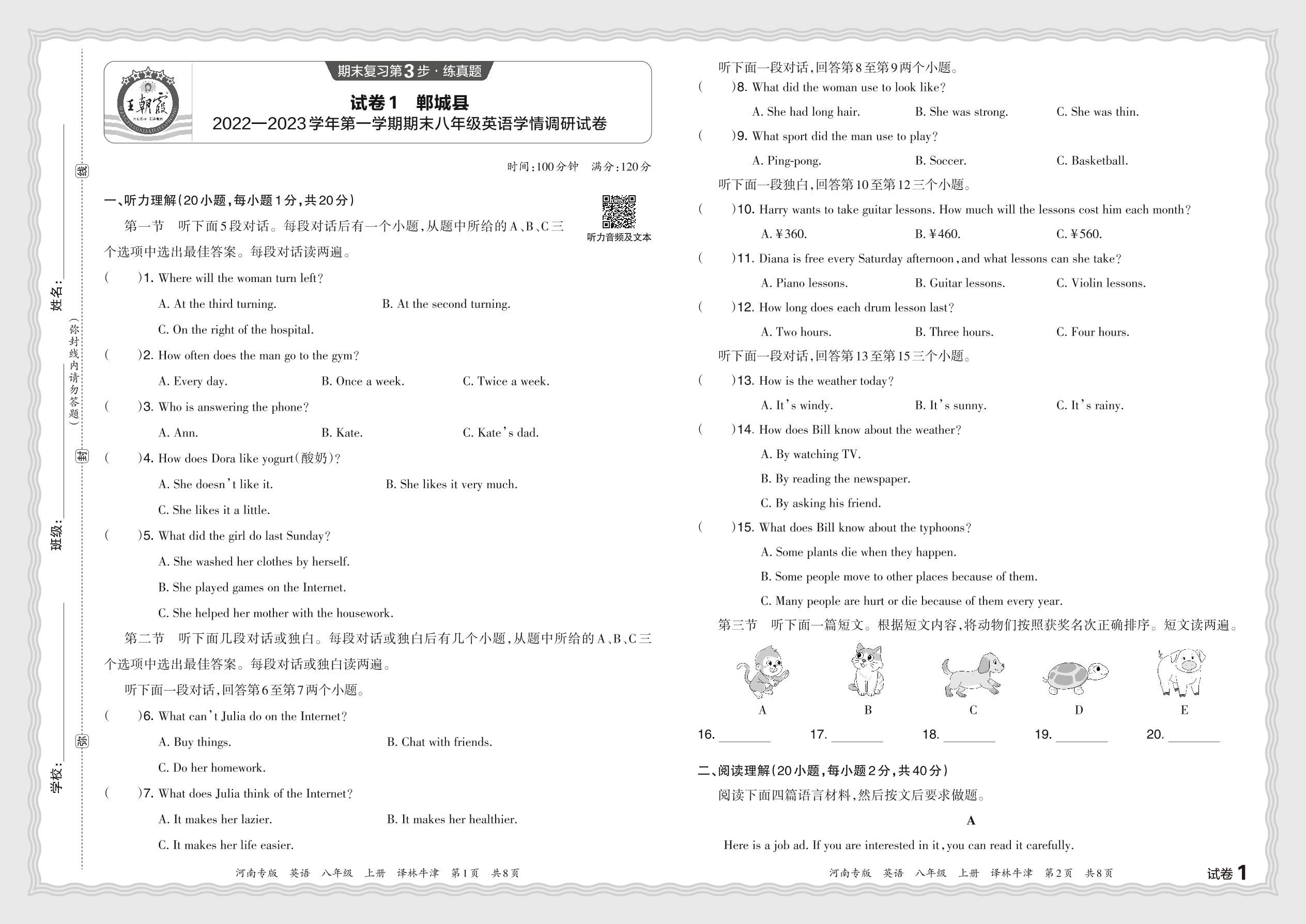 河南省周口市郸城县2022—2023学年第一学期期末八年级英语学情调研试卷(译林牛津版)【1】