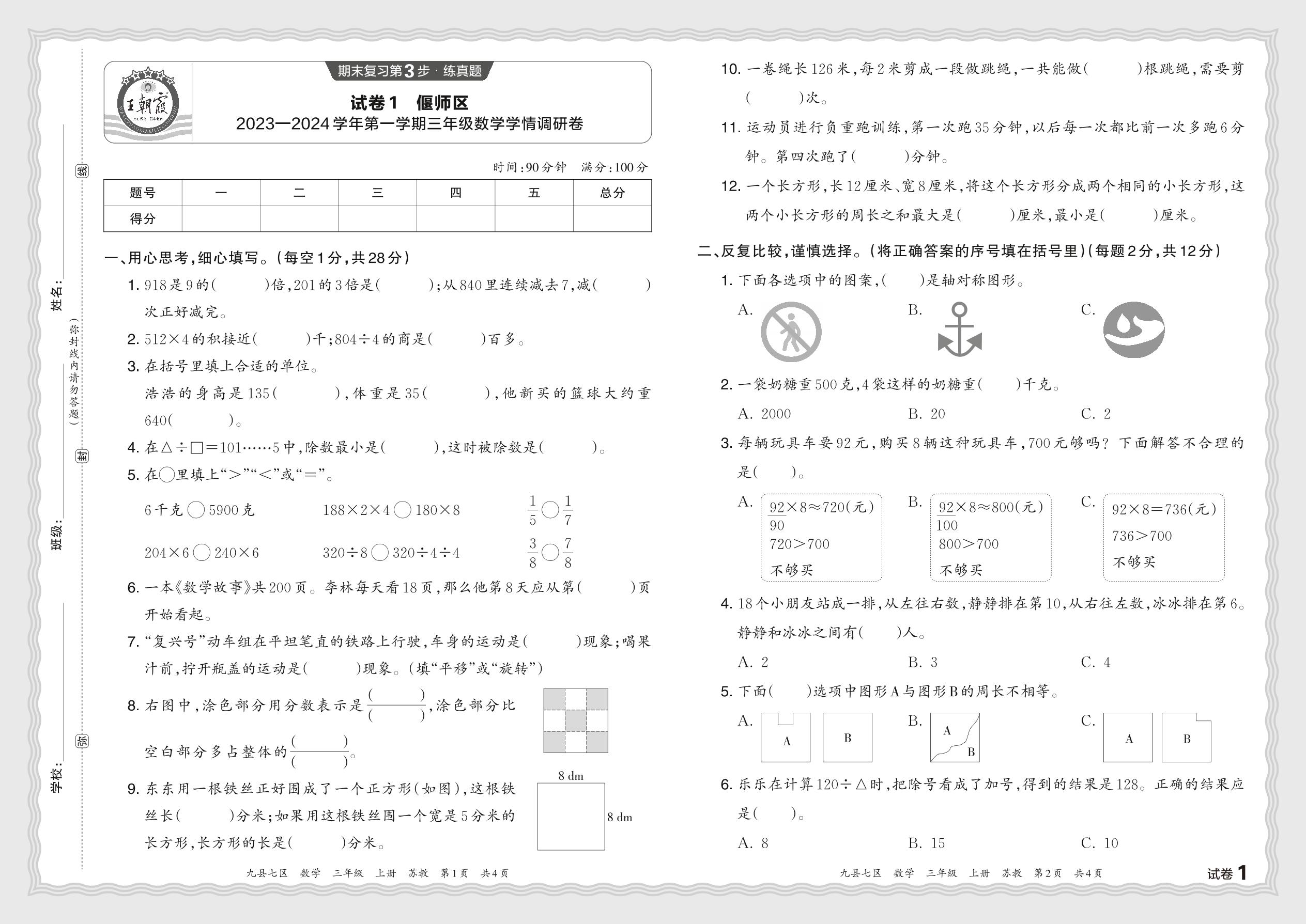 河南省洛阳市偃师区2023—2024学年第一学期三年级数学学情调研卷【1】
