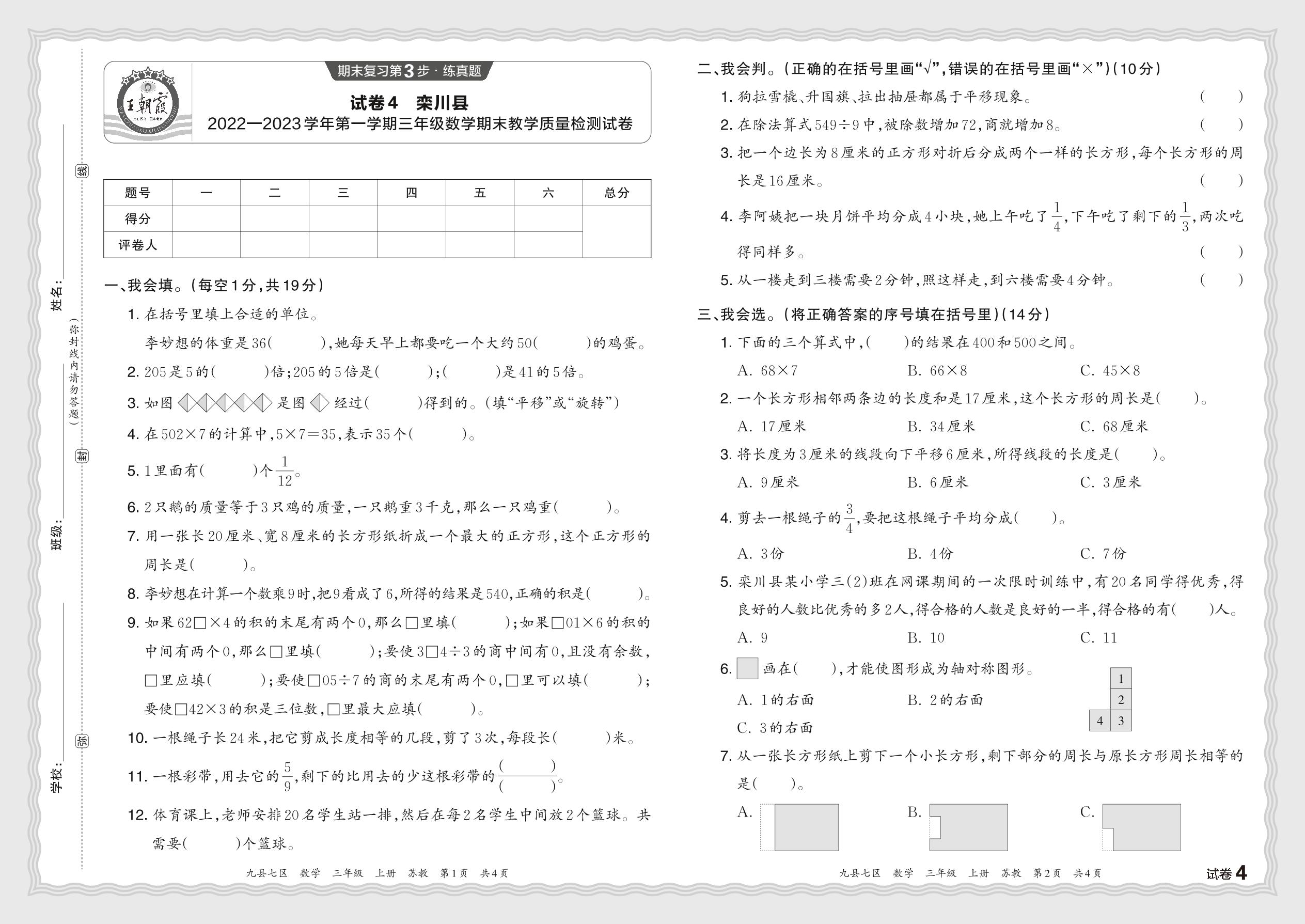 河南省洛阳市栾川县2022—2023学年第一学期三年级数学期末教学质量检测试卷(苏教版)【4】