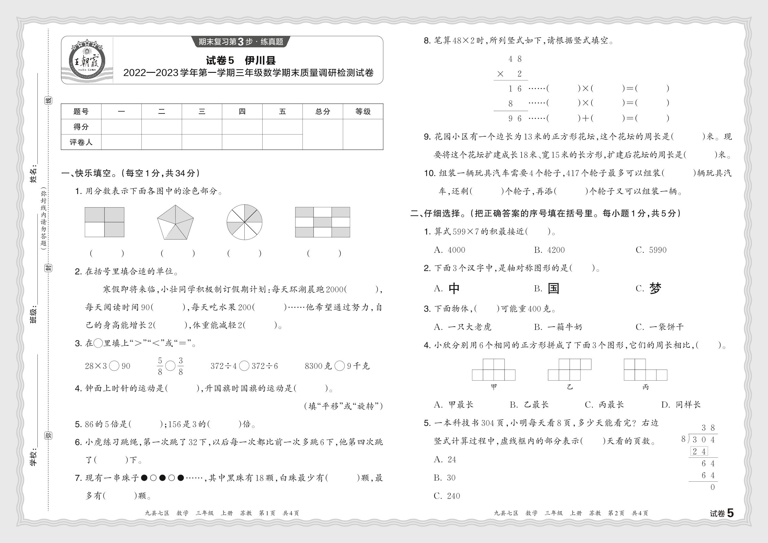 河南省洛阳市伊川县2022—2023学年第一学期三年级数学期末质量调研检测试卷(苏教版)【5】