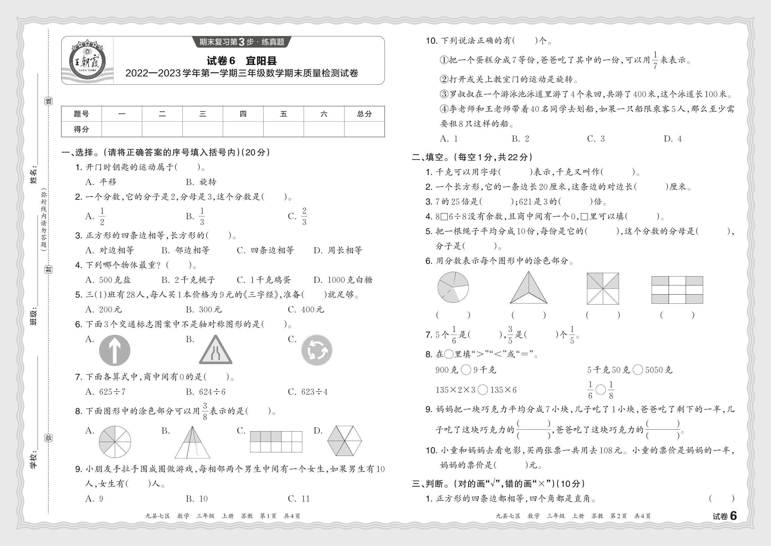 河南省洛阳市宜阳县2022—2023学年第一学期三年级数学期末质量检测试卷(苏教版)【6】