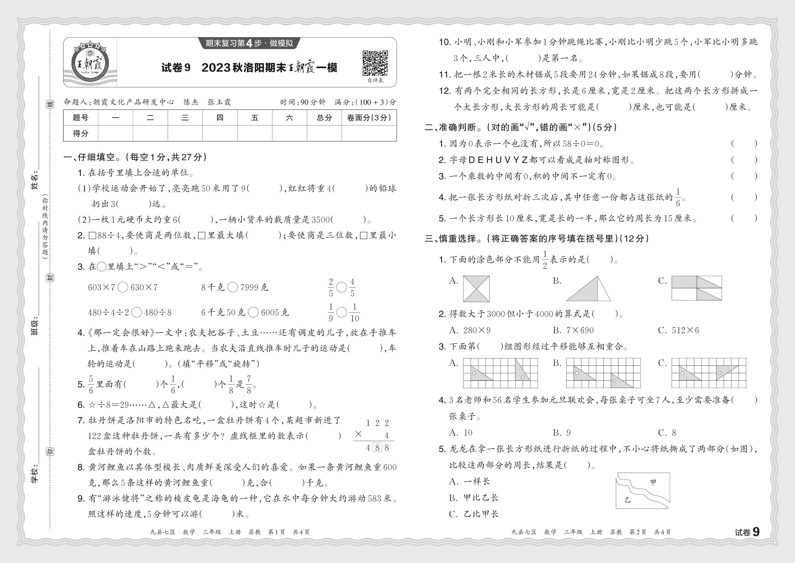 2023秋上册三年级数学苏教版 河南洛阳期末王朝霞一模【9】