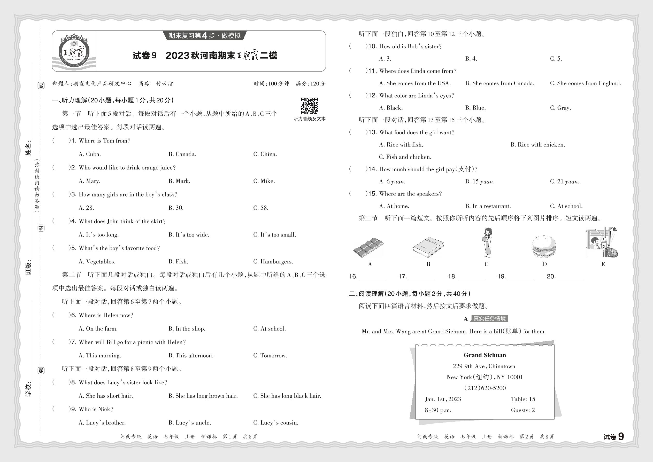 2023秋上册七年级英语新课标版 河南期末王朝霞二模