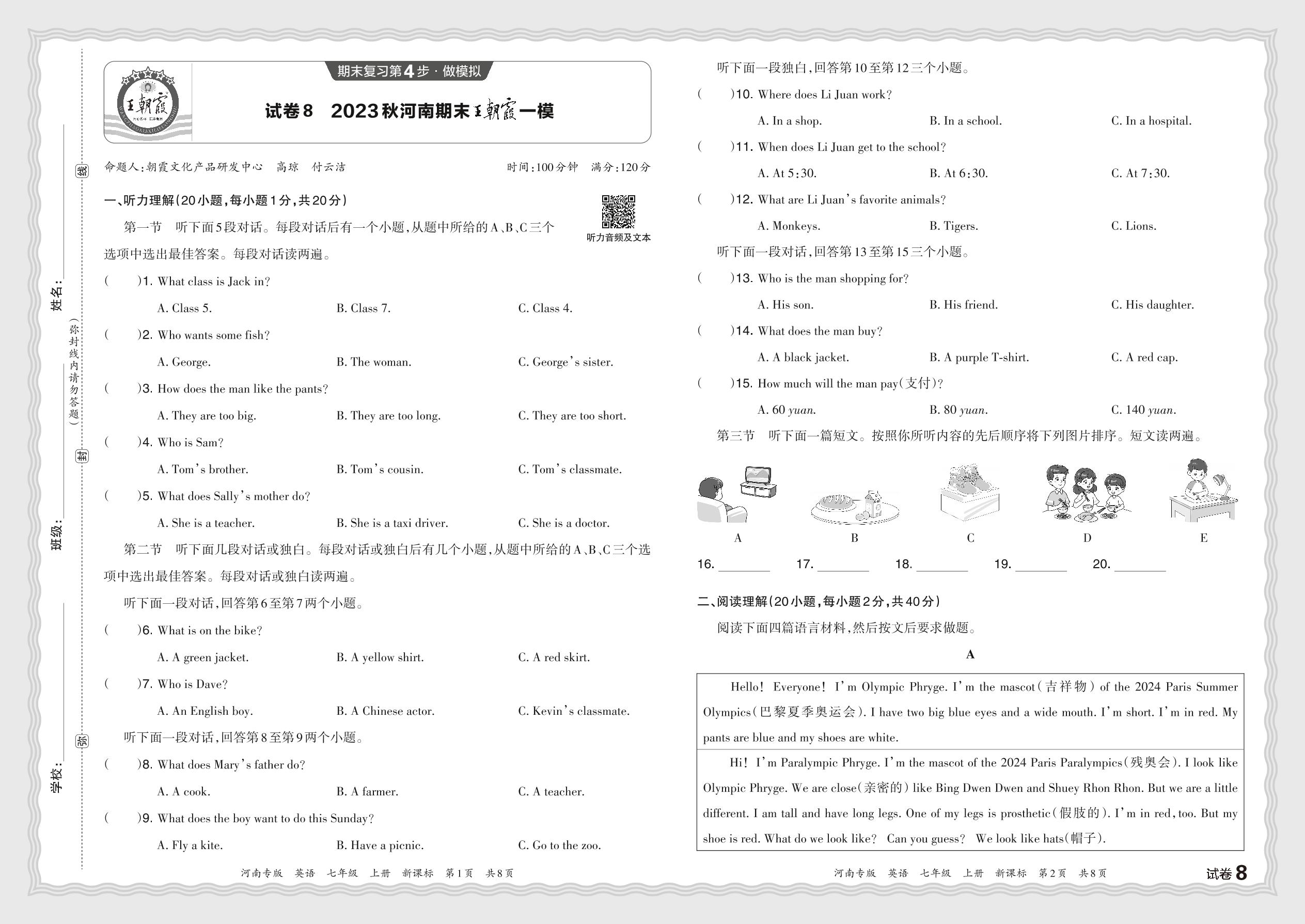 2023秋上册七年级英语新课标版 河南期末王朝霞一模