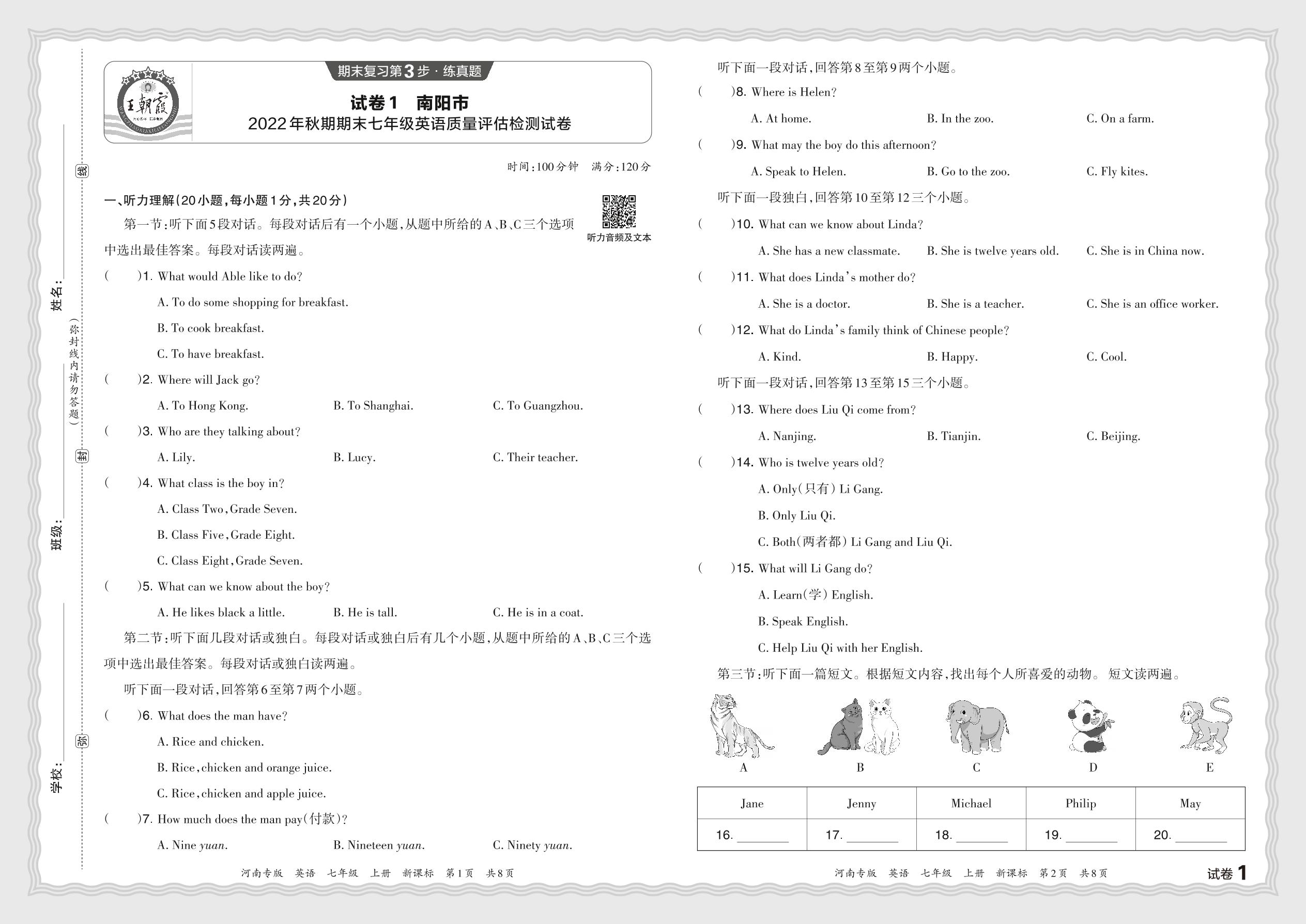 河南省南阳市2022年秋期期末七年级英语质量评估检测试卷(新课标版)【1】
