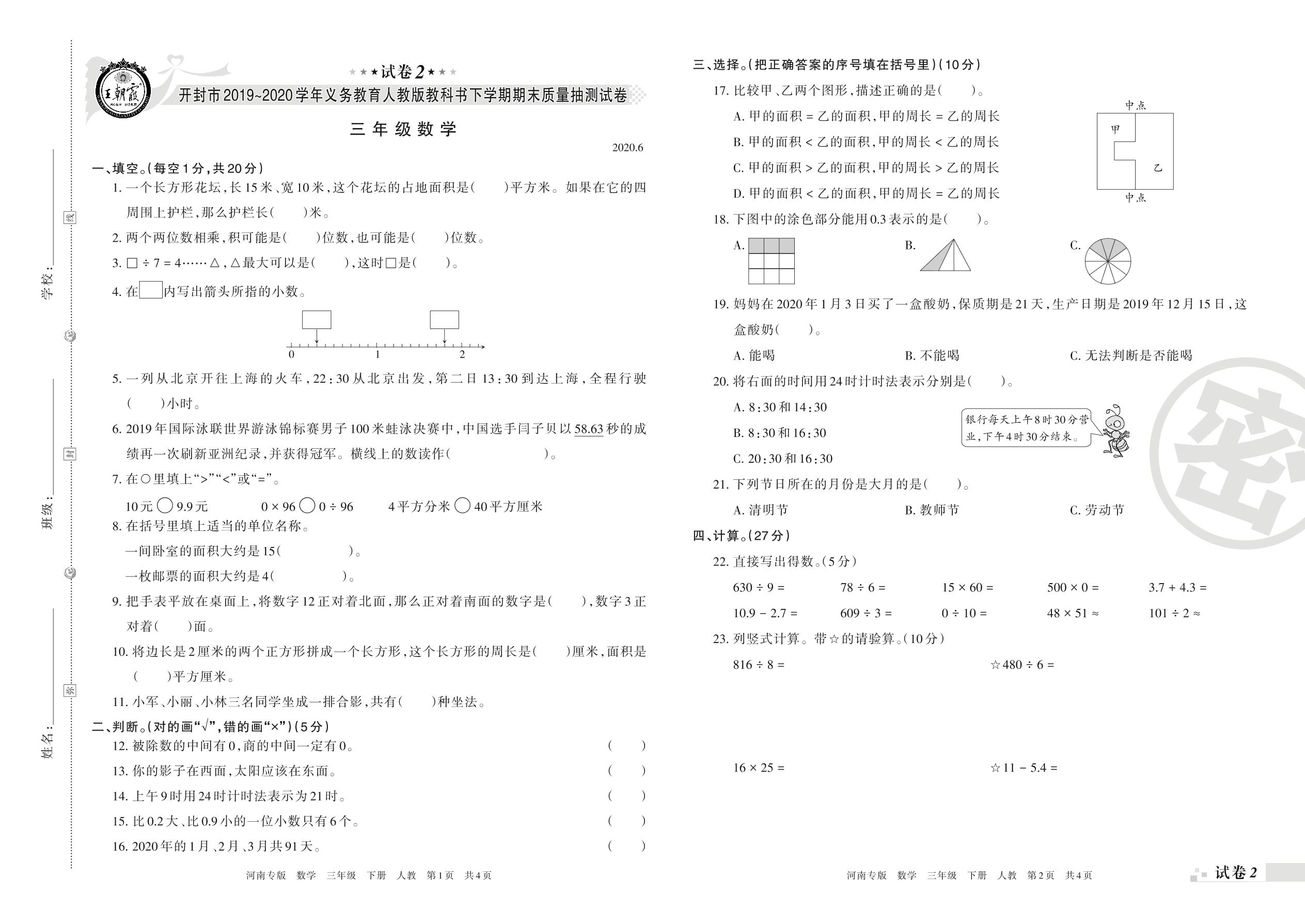 2019-2020学年第二学期开封市三年级数学试卷(人教版)【2】