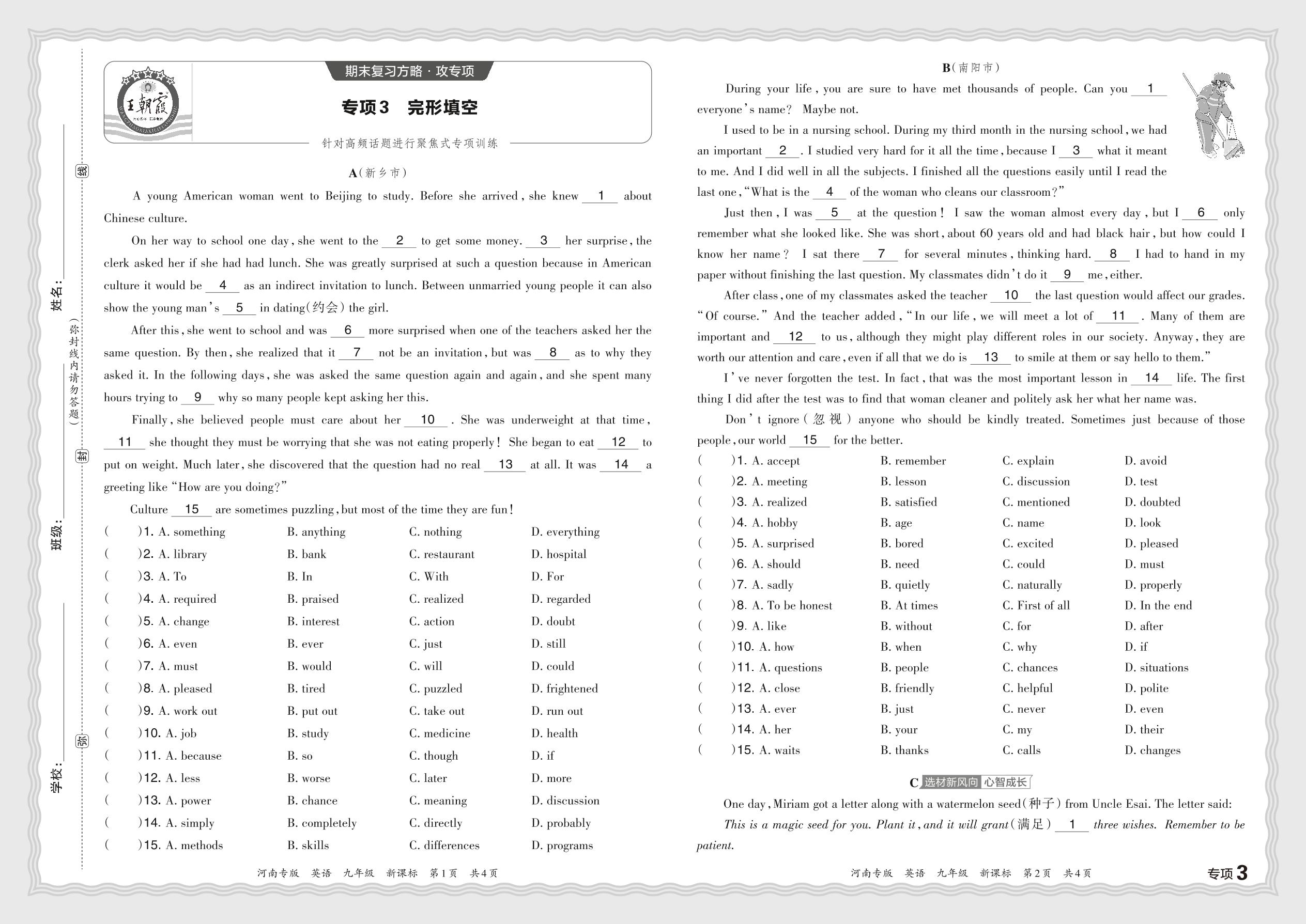 2023秋上册九年级英语新课标版 期末专项卷·完形填空【3】