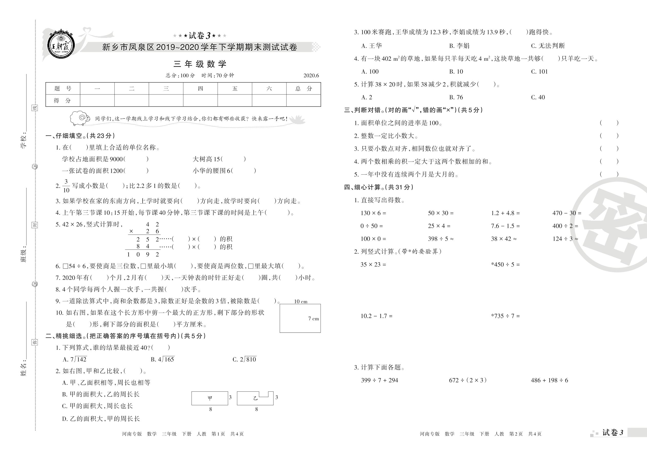 2019-2020学年第二学期新乡市凤泉区三年级数学试卷(人教版)【3】