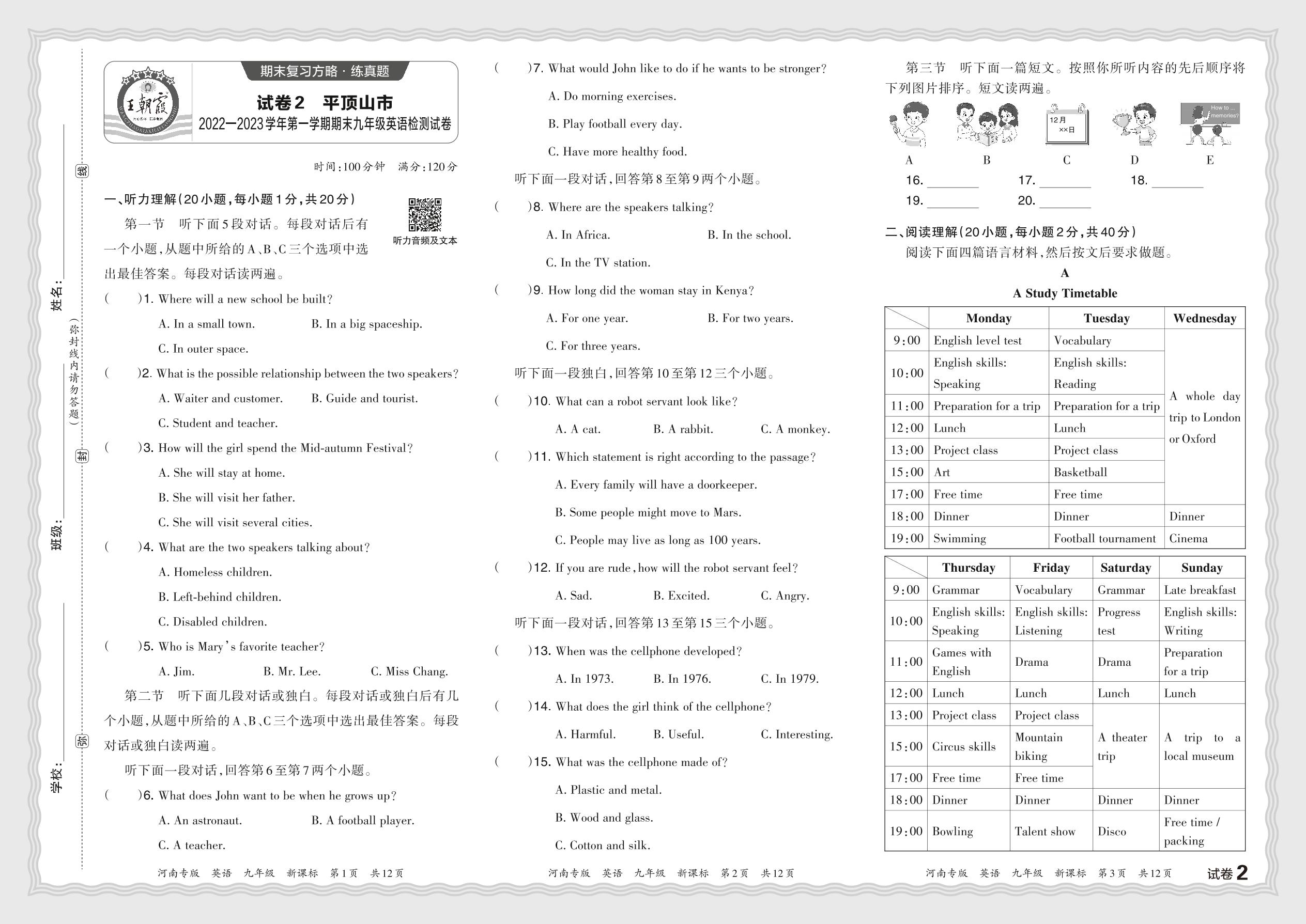 河南省平顶山市2022—2023学年第一学期期未九年级英语检测试卷(新课标版)【2】
