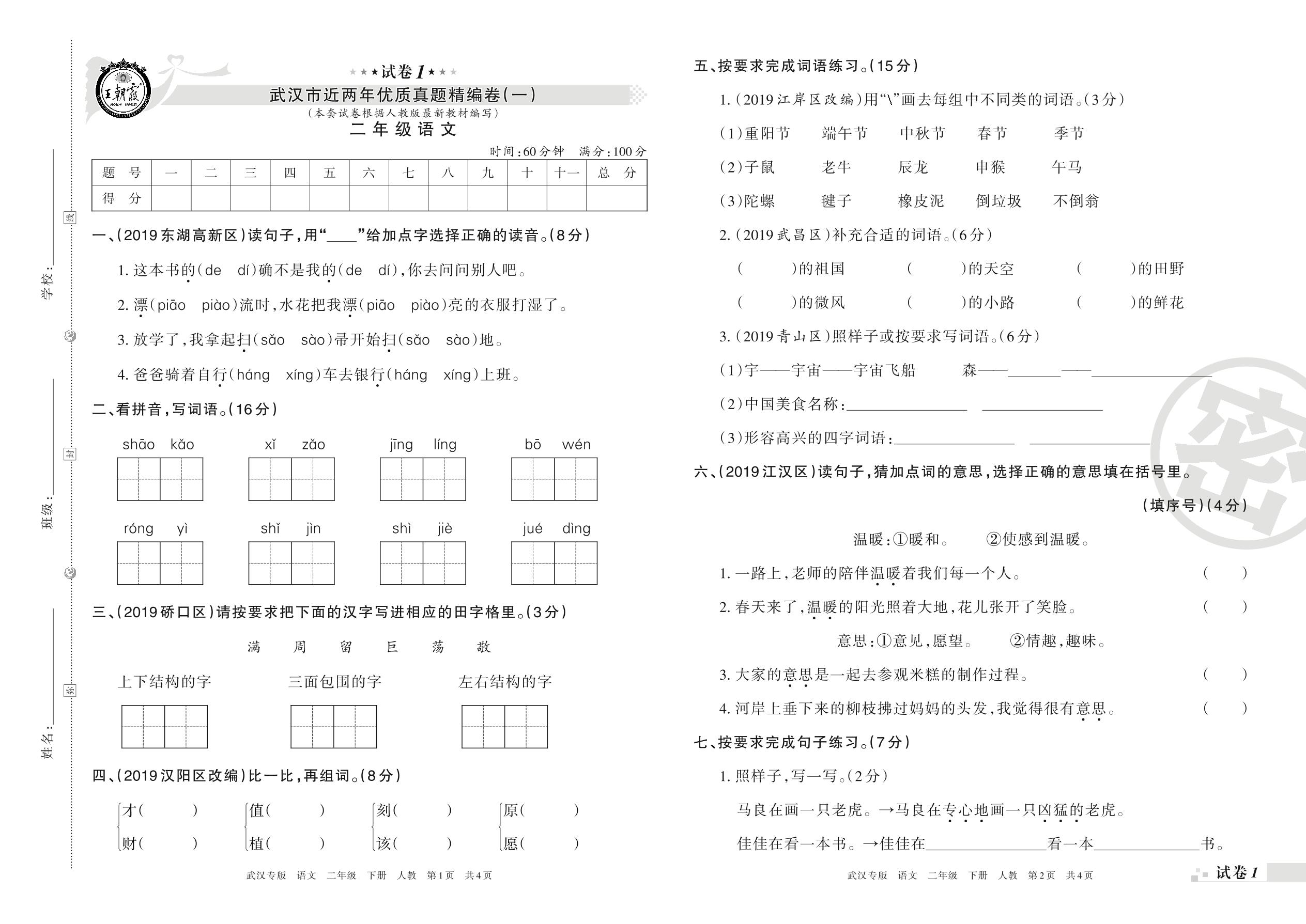 武汉市近两年优质真题精编卷(一)二年级下册语文(人教版)【1】