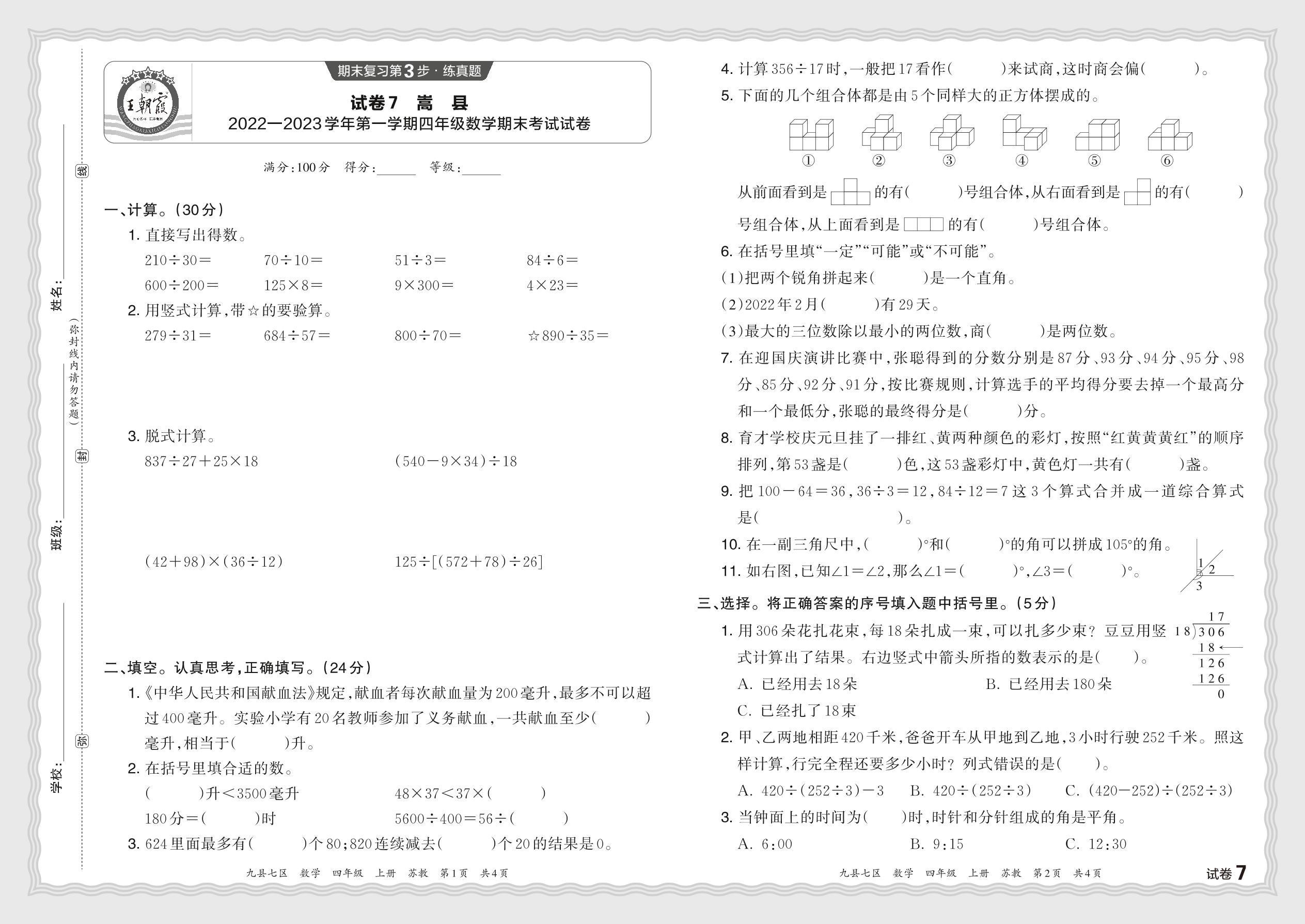 四年级数学苏教版上册期末卷