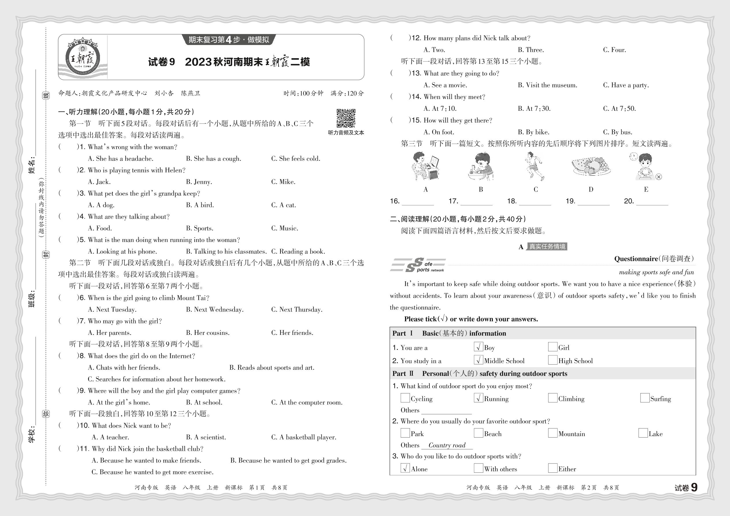 2023秋上册八年级英语新课标版 河南期末王朝霞二模