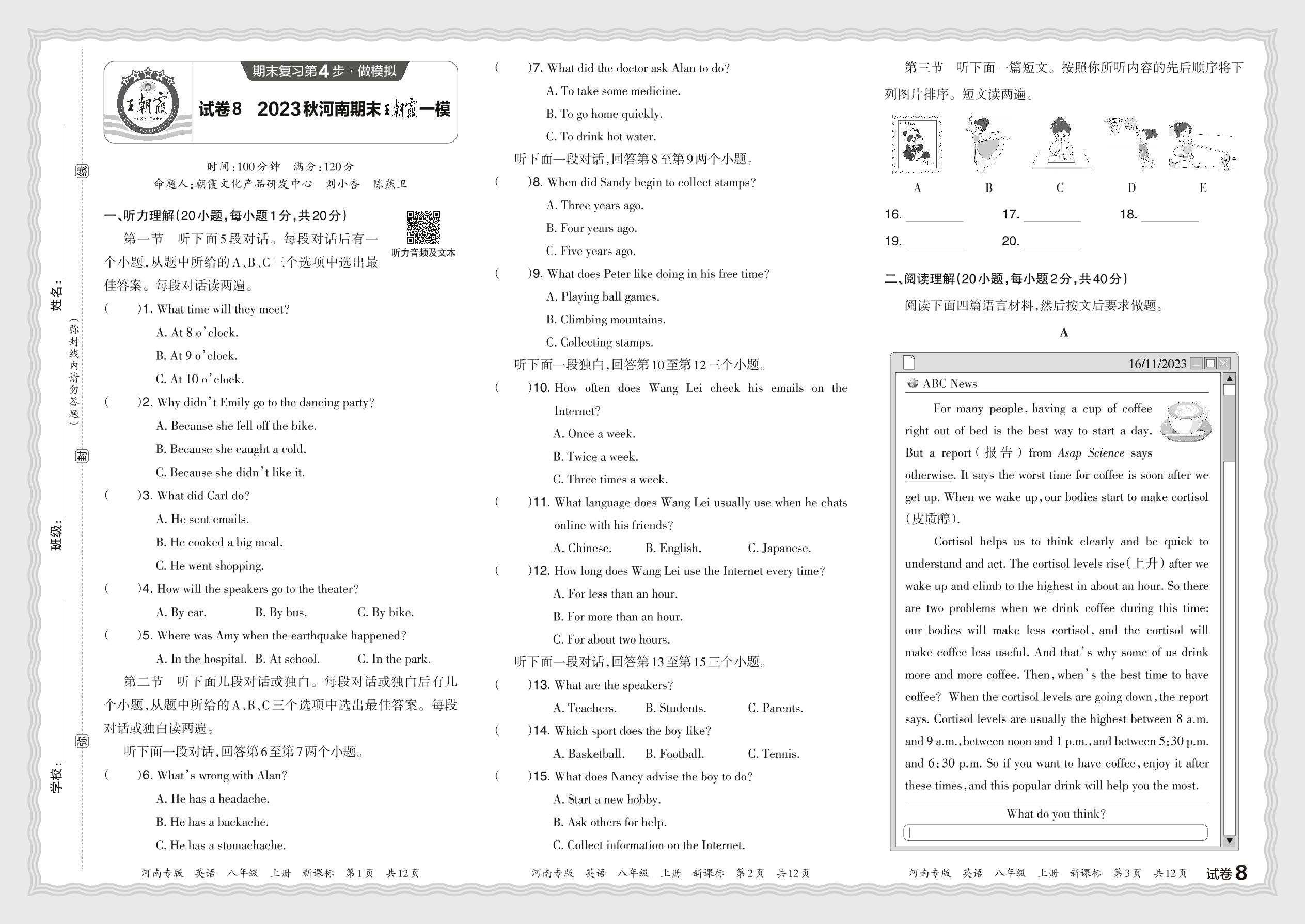 2023秋上册八年级英语新课标版 河南期末王朝霞一模