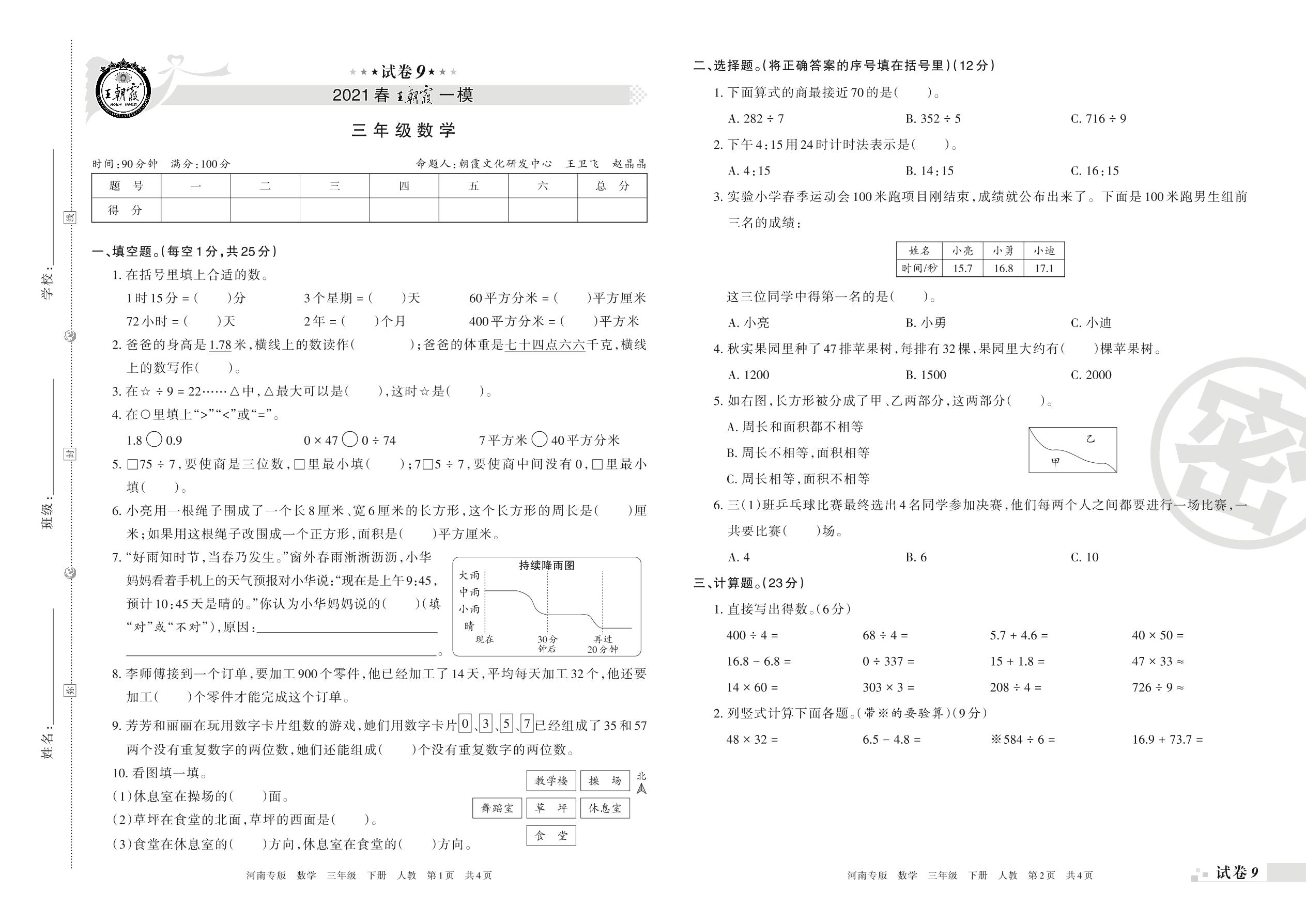 王朝霞期末模拟卷三年级下册数学(人教版)_R21080485819【9】