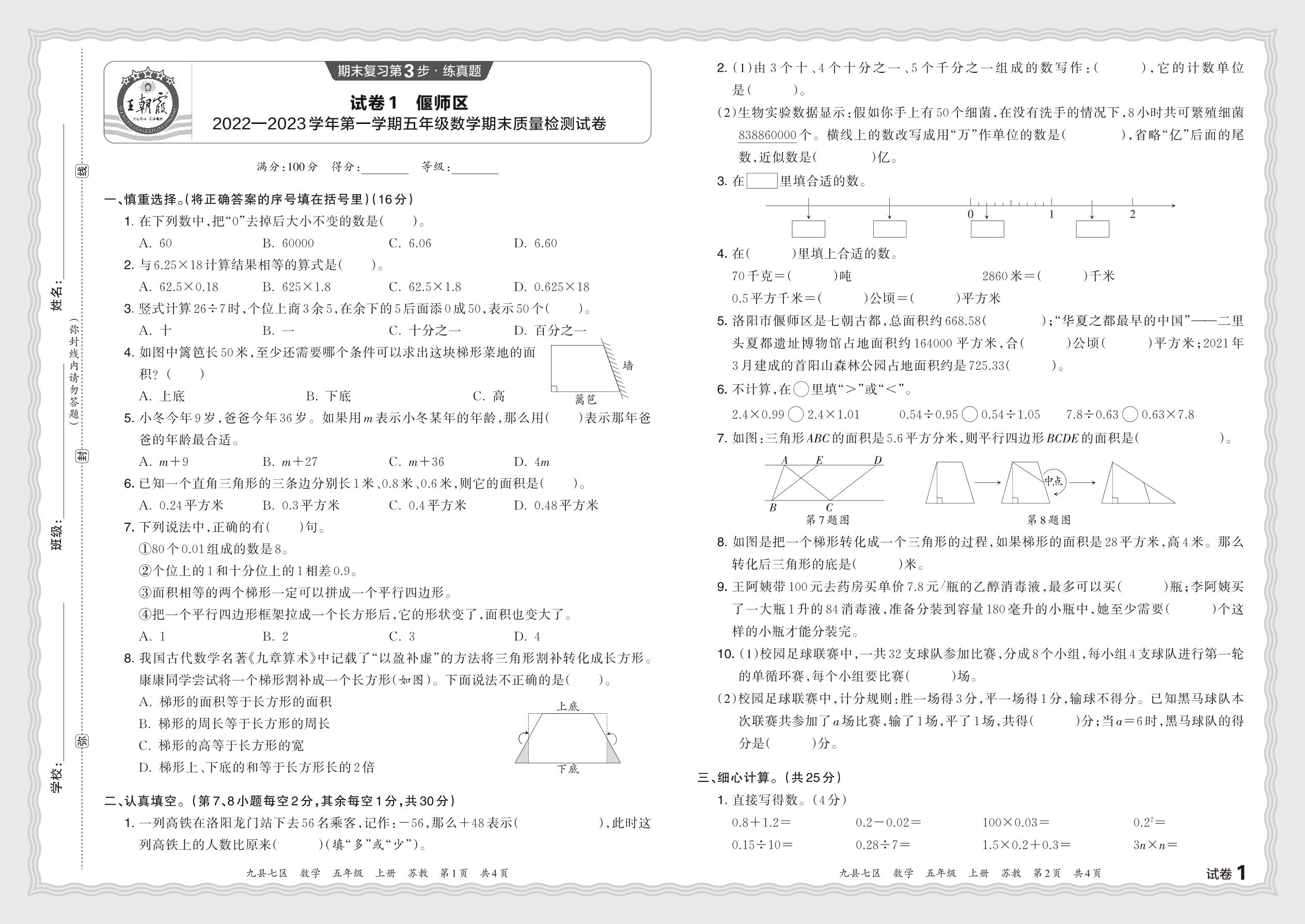 河南省洛阳市偃师区2022—2023学年第一学期五年级数学期末质量检测试卷(苏教版)【1】