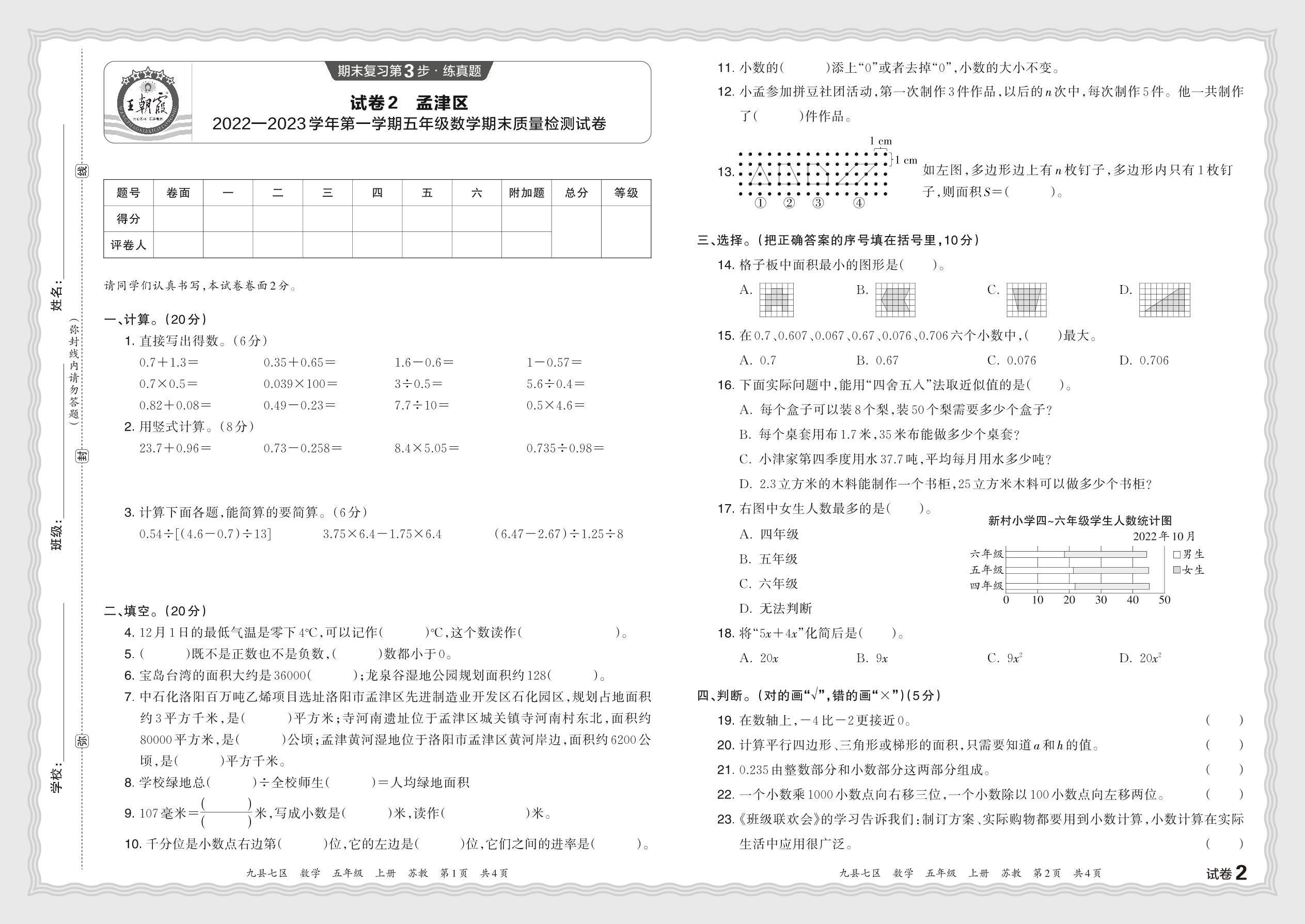 河南省洛阳市孟津区2022—2023学年第一学期五年级数学期末质量检测试卷(苏教版)【2】