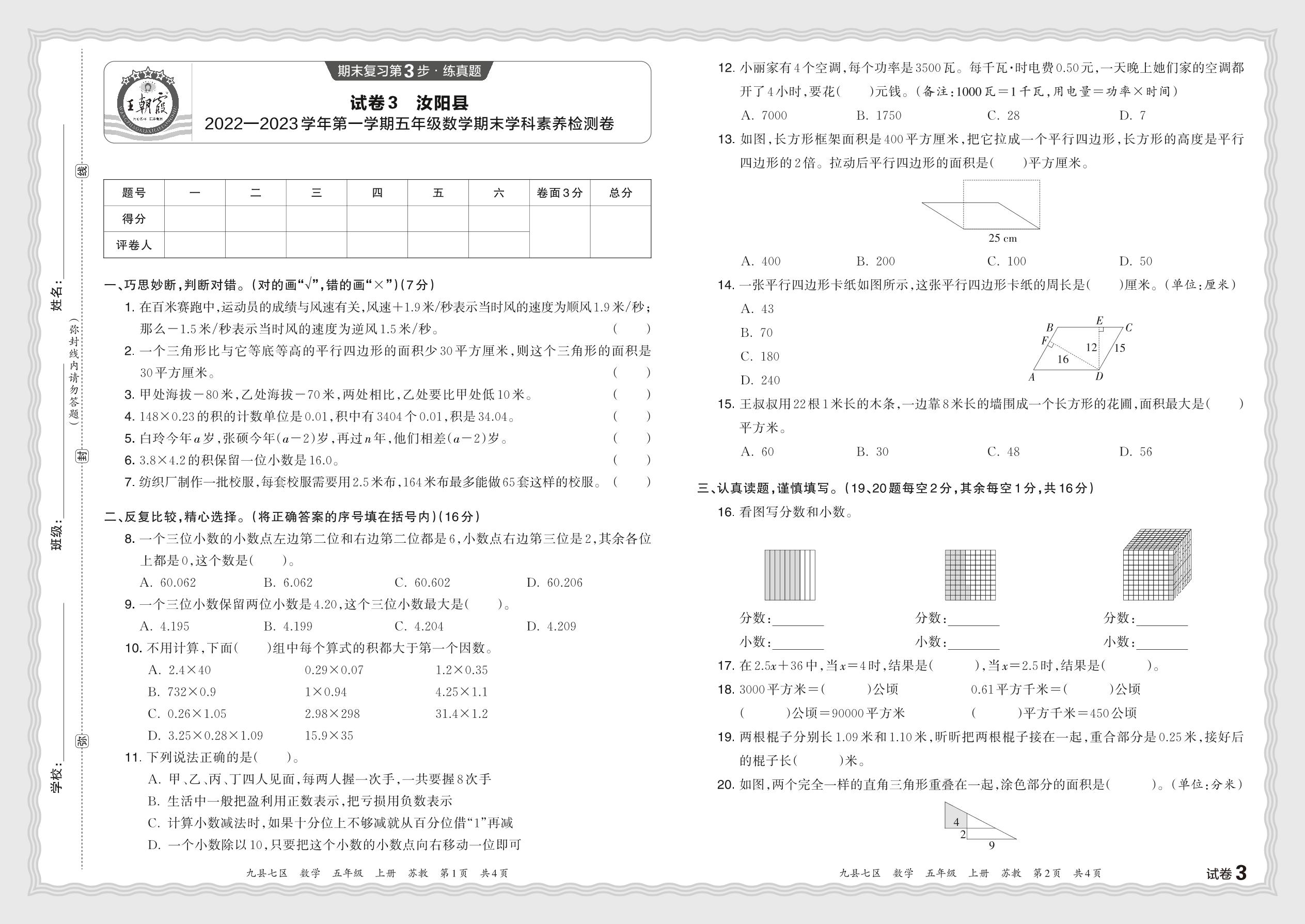 五年级数学苏教版上册期末卷