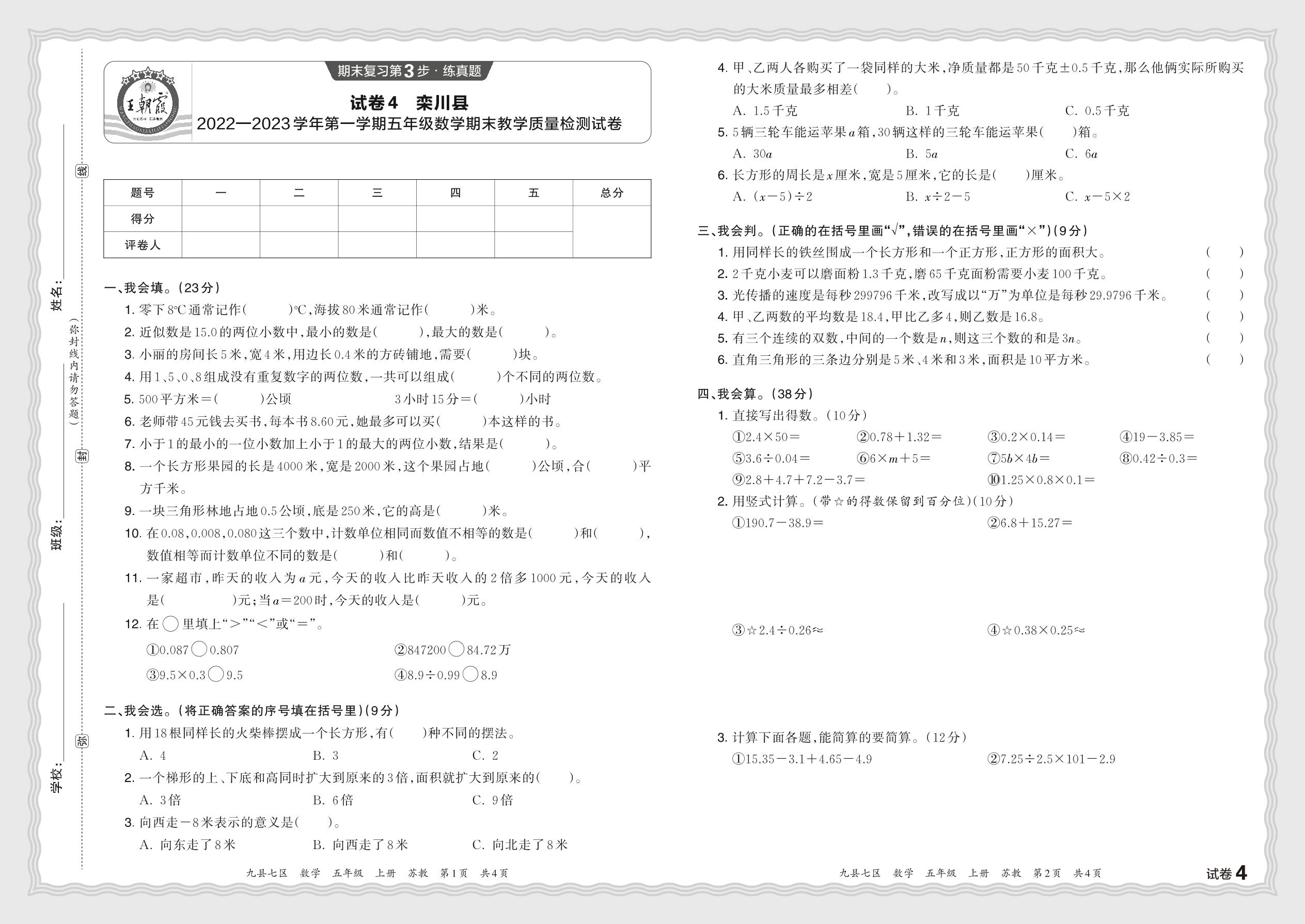 河南省洛阳市栾川县2022—2023学年第一学期五年级数学期末教学质量检测试卷(苏教版)【4】
