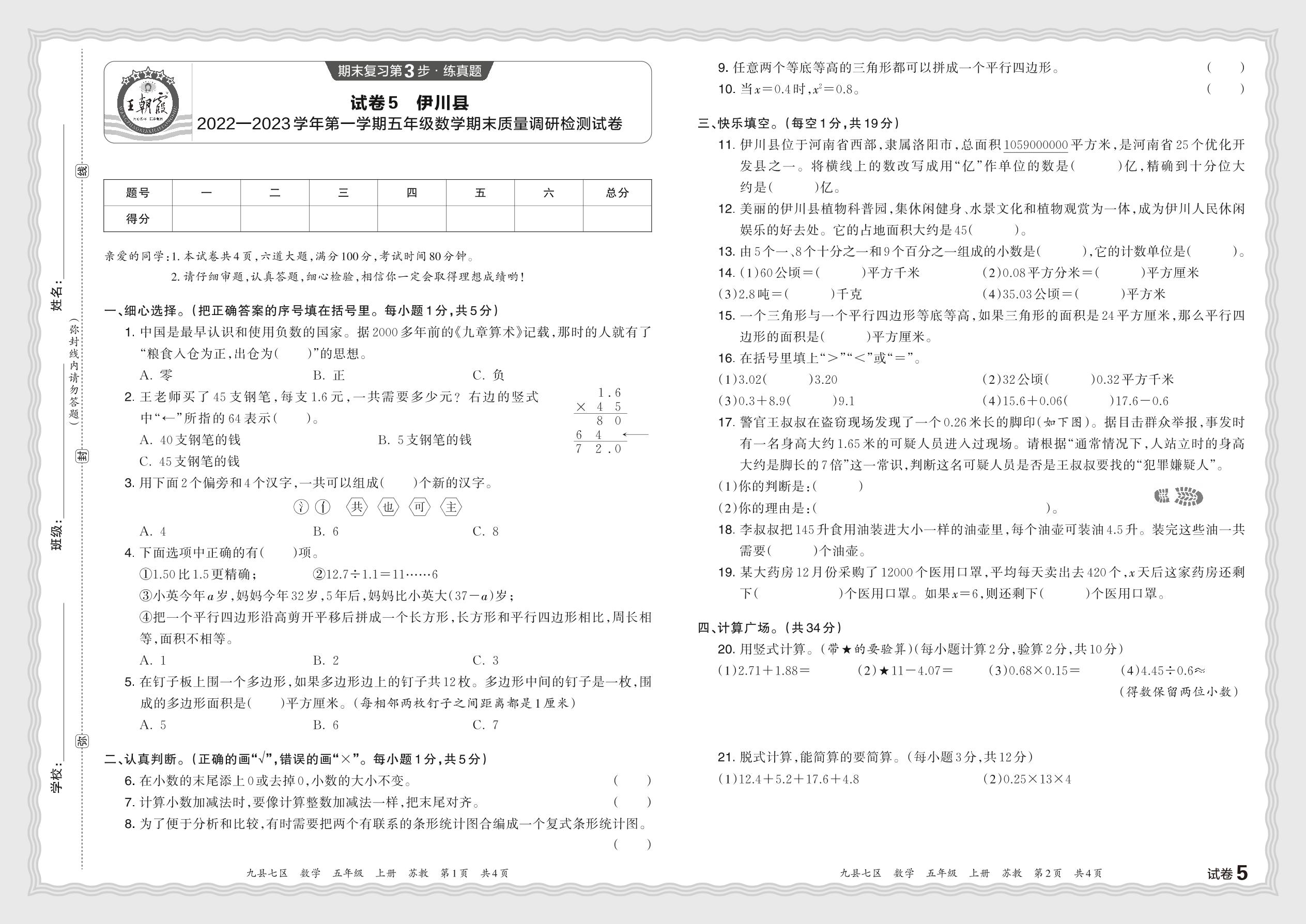 河南省洛阳市伊川县2022—2023学年第一学期五年级数学期末质量调研检测试卷(苏教版)【5】