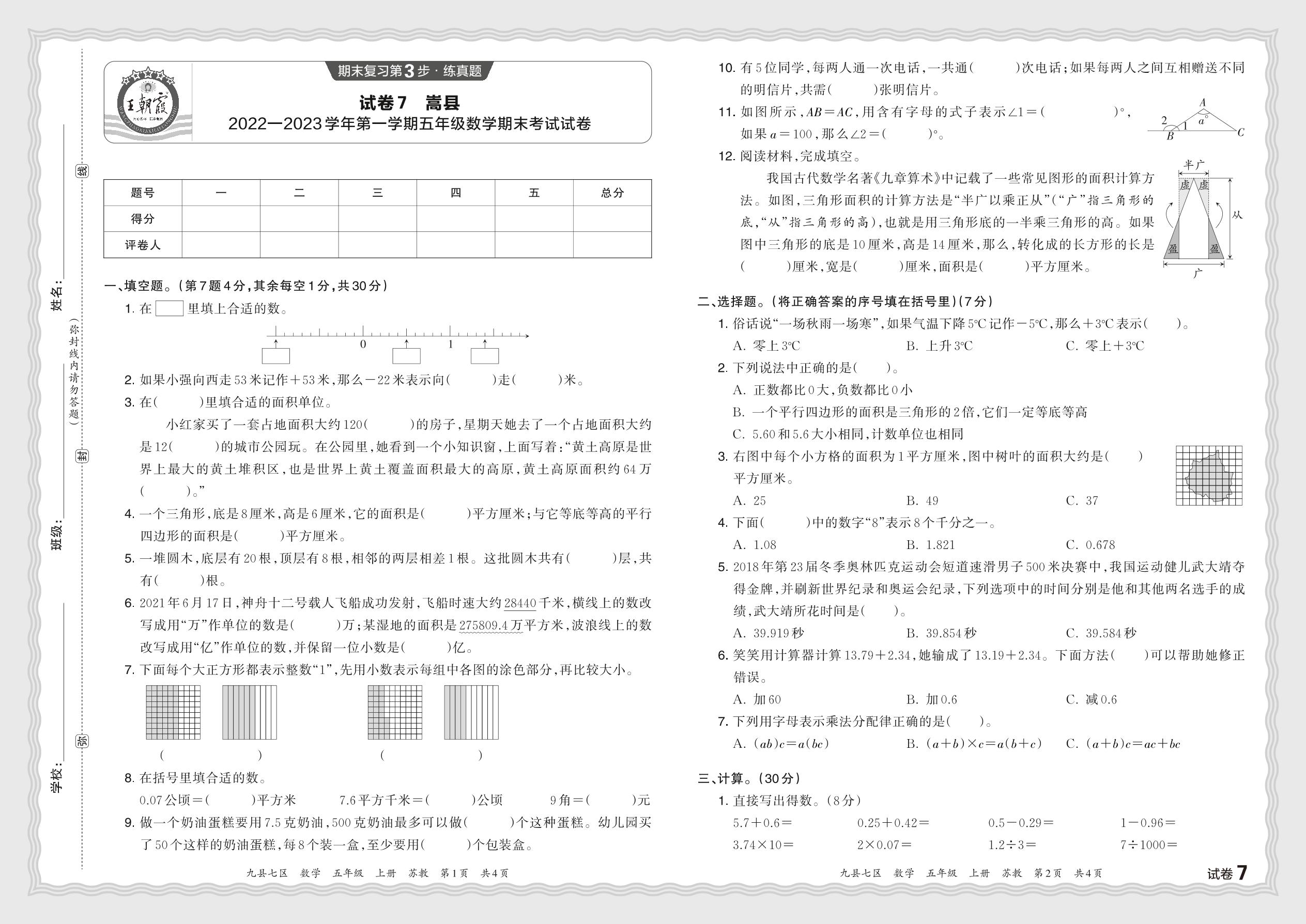 河南省洛阳市嵩县2022—2023学年第一学期五年级数学期末考试试卷(苏教版)【7】