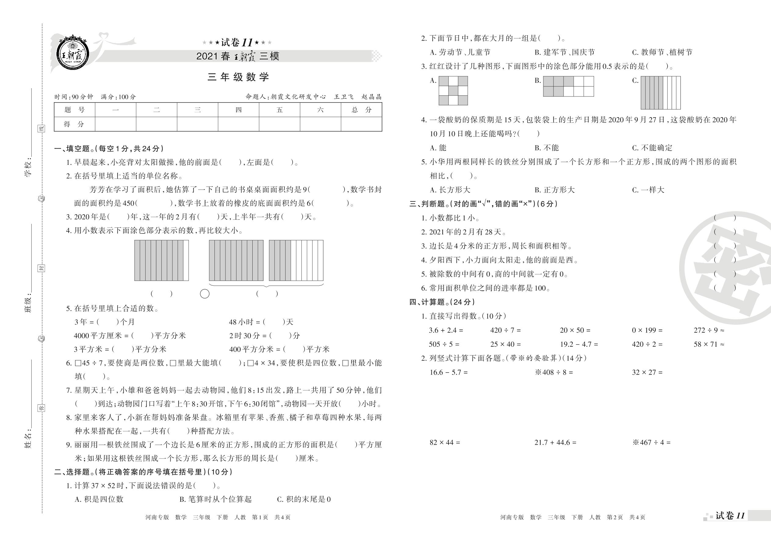 王朝霞期末模拟卷三年级下册数学(人教版)_R21080485843【11】