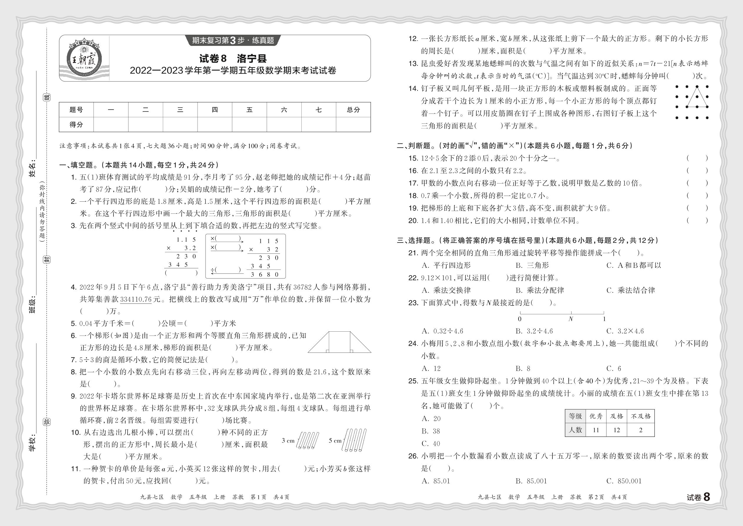 河南省洛阳市洛宁县2022—2023学年第一学期五年级数学期末考试试卷(苏教版)【8】