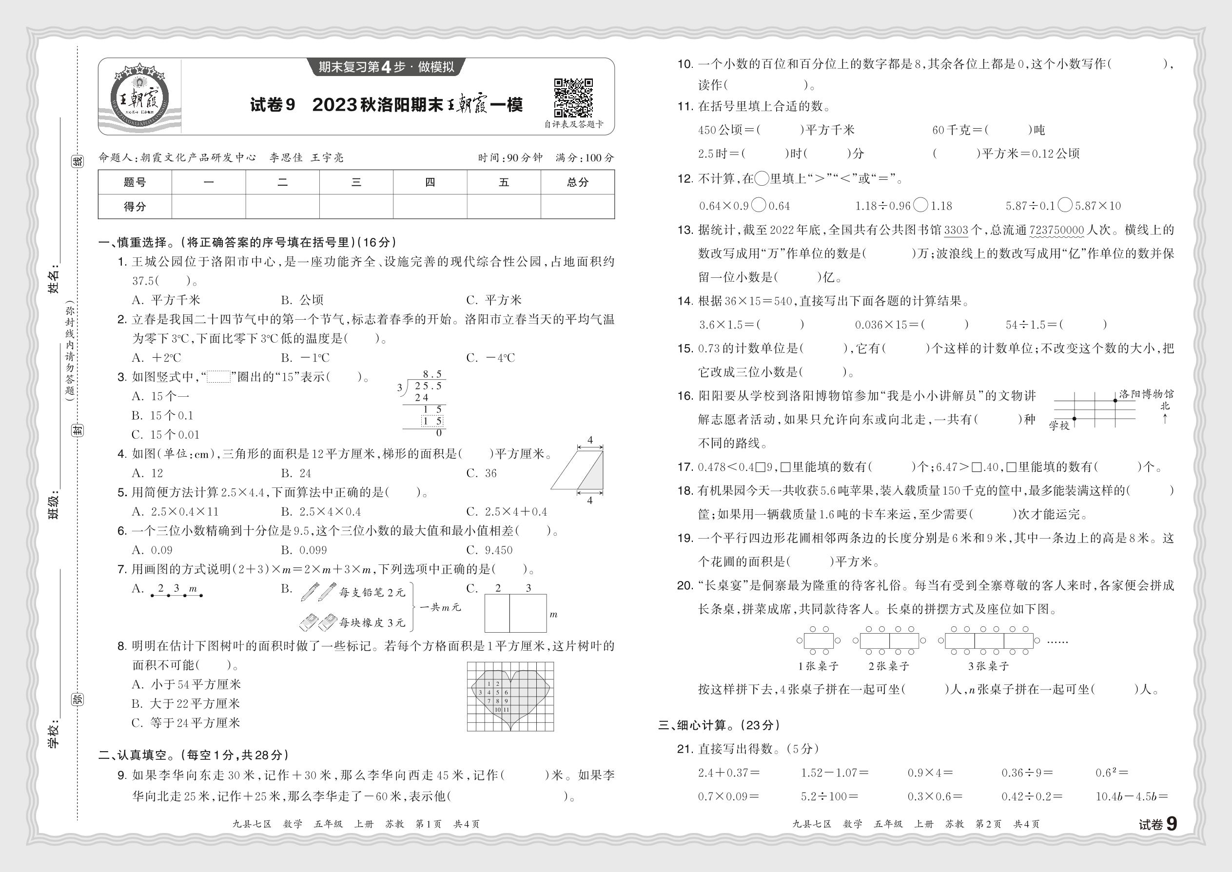 2023秋上册五年级数学苏教版 河南洛阳期末王朝霞一模【9】