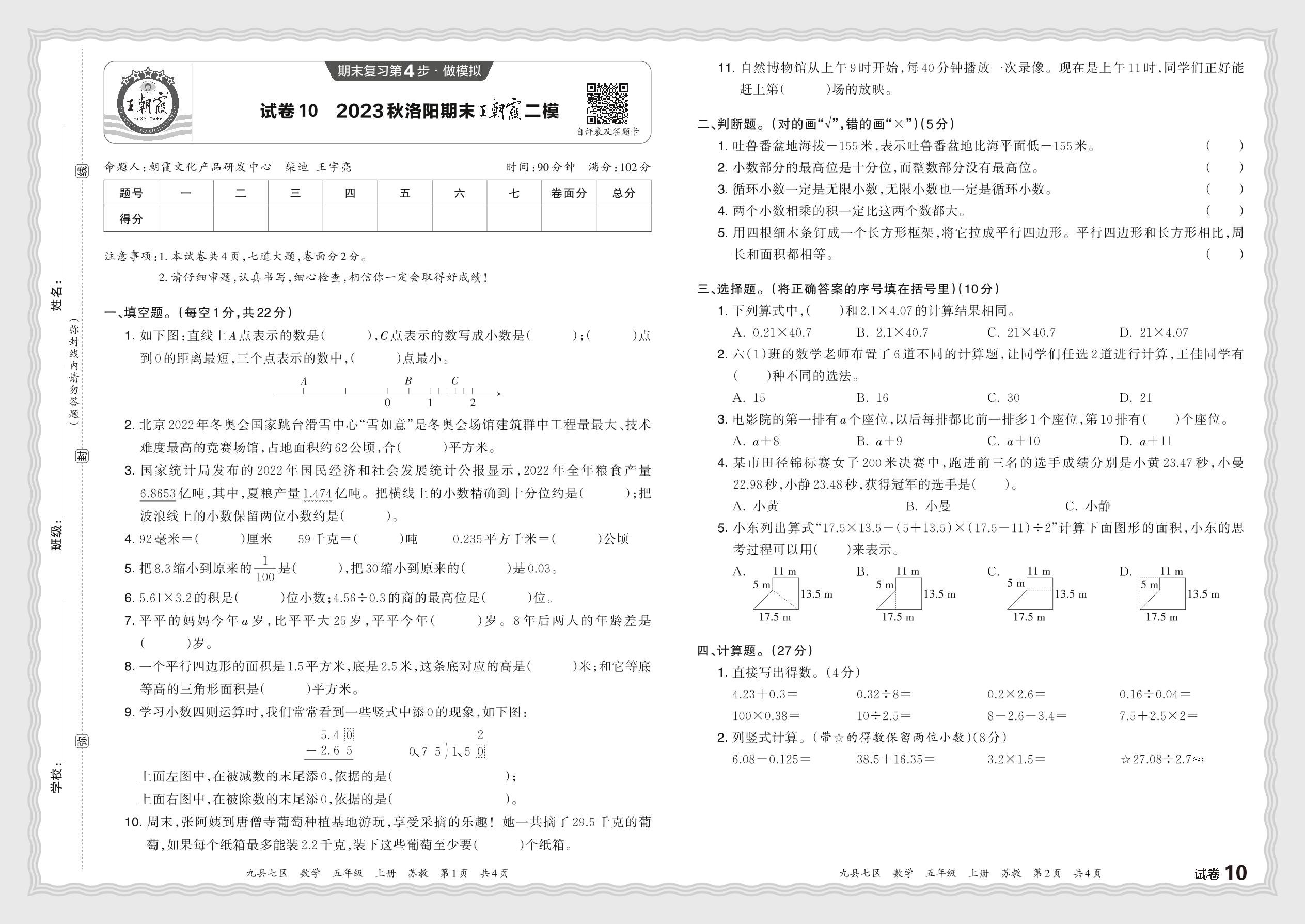 2023秋上册五年级数学苏教版 河南洛阳期末王朝霞二模【10】