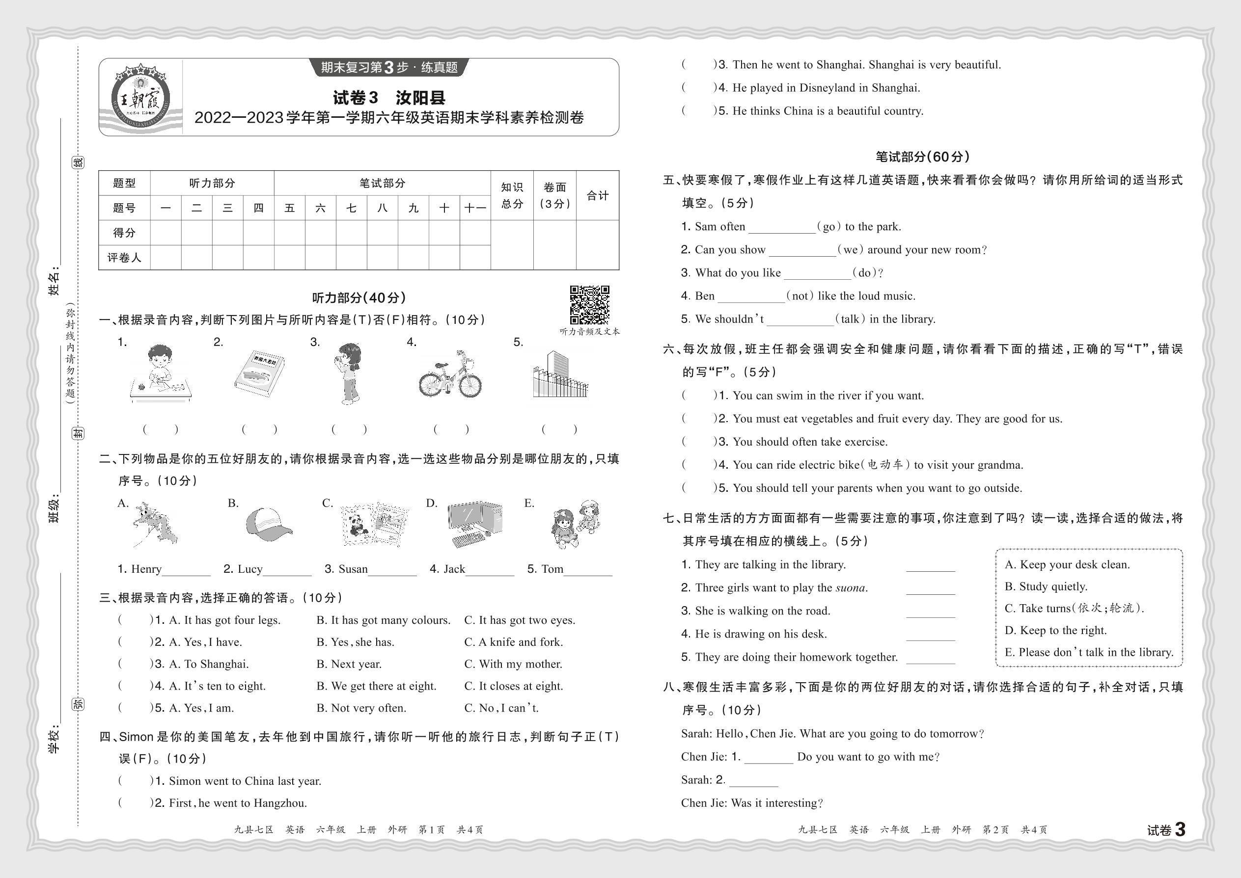 河南省洛阳市汝阳县2022—2023学年第一学期六年级英语学科素养检测卷(外研版)【3】