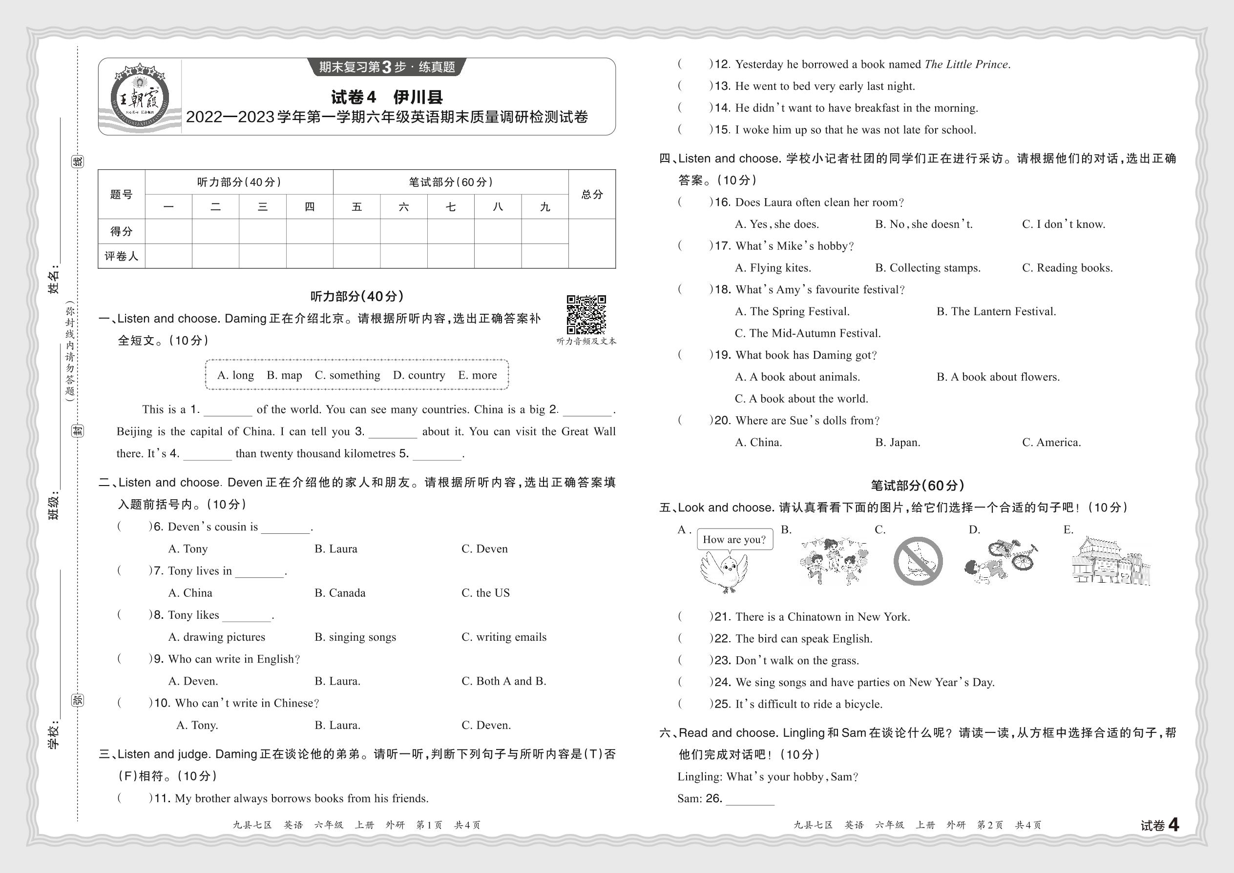河南省洛阳市伊川县2022—2023学年第一学期六年级英语期末质量调研检测试卷(外研版)【4】