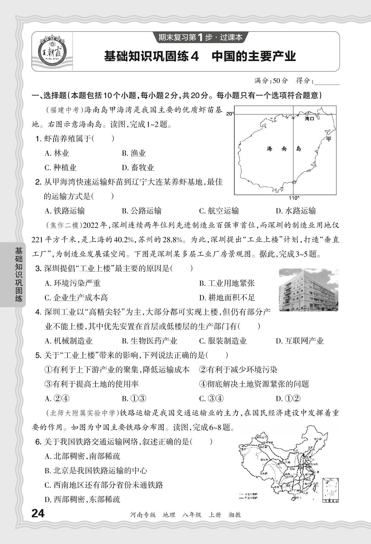 2023秋上册八年级地理湘教版 期末过课本·基础知识巩固练 中国的主要产业【4】