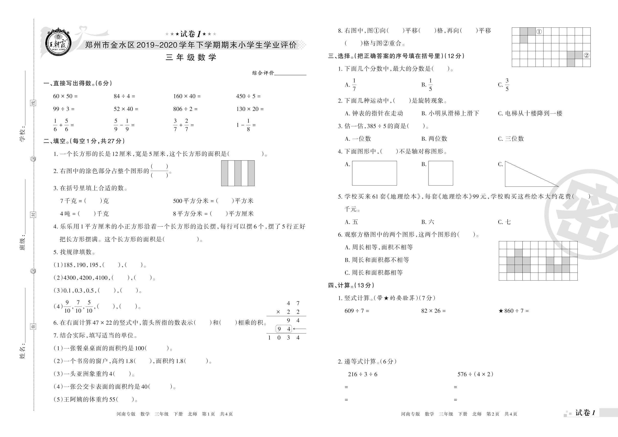 2019-2020学年第二学期郑州市金水区三年级数学试卷(北师版)_R21080485911【1】