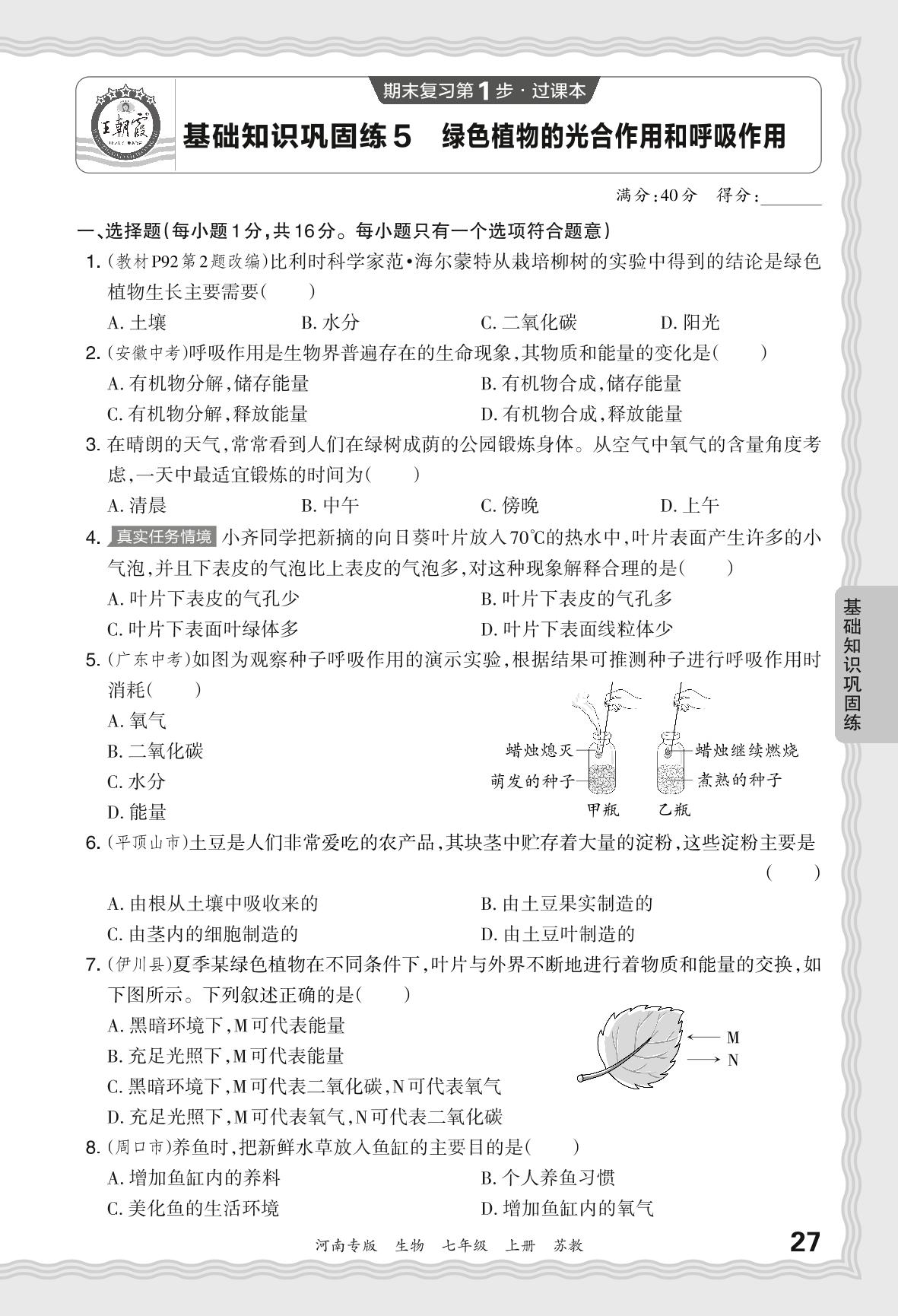 2023秋上册七年级生物苏教版 期末过课本·基础知识巩固练 绿色植物的光合作用和呼吸作用【5】
