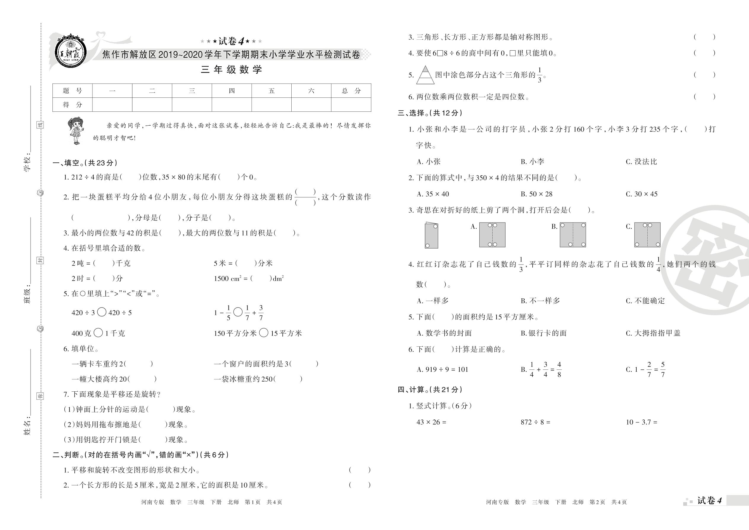 2019-2020学年第二学期焦作市解放区三年级数学试卷(北师版)【4】